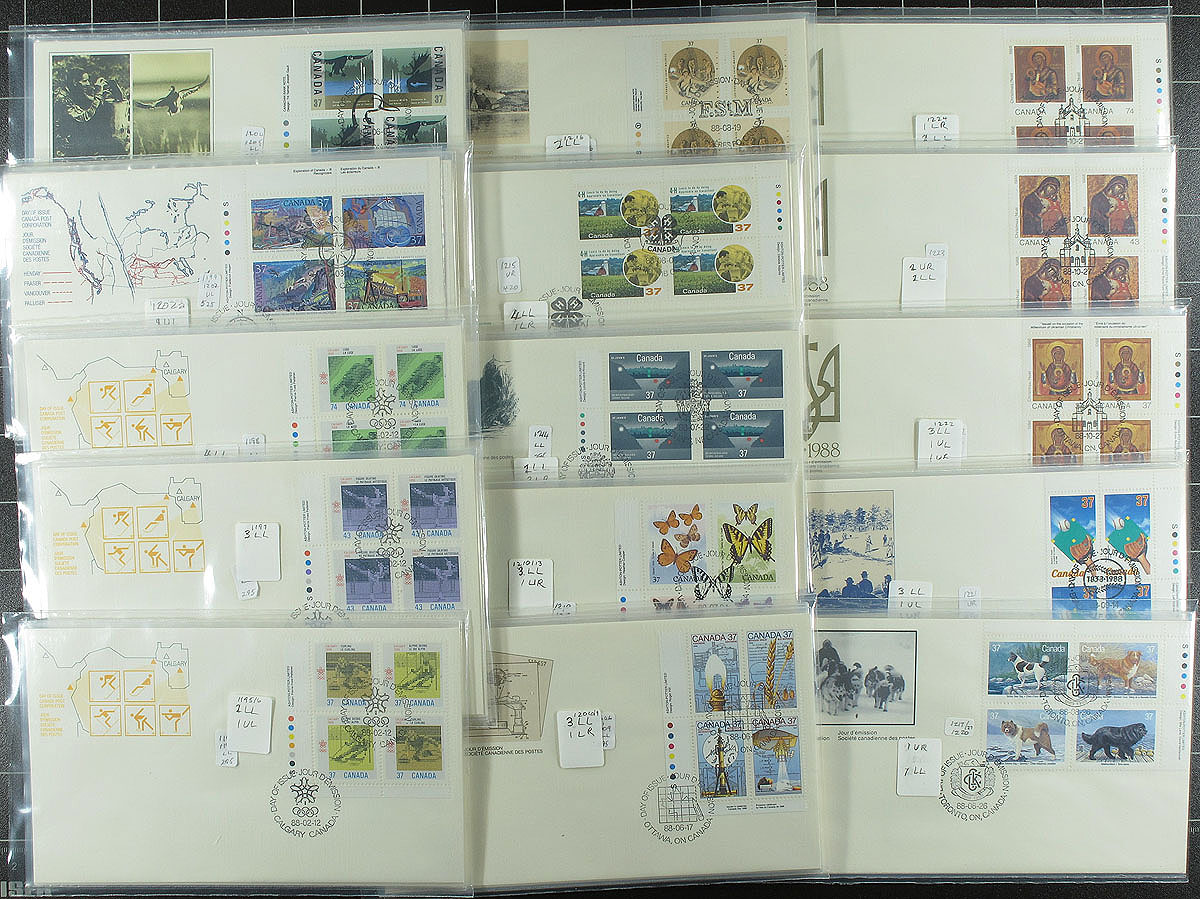 Extensive selection of Official First Day Covers from 1988 to 1998 period (#1195/1617), all with plate blocks and individually sleeved. There are 408 covers in all and the total face value of the stamps on cover alone is $757.68. Huge original cost and even bigger catalogue value if priced by the Chung-Narbonne Specialized catalogue. Estimate =
