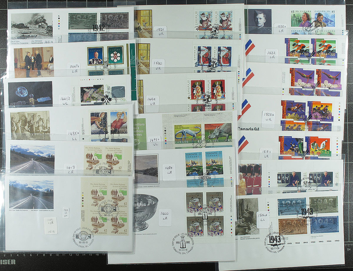 Extensive selection of Official First Day Covers from 1988 to 1998 period (#1195/1617), all with plate blocks and individually sleeved. There are 408 covers in all and the total face value of the stamps on cover alone is $757.68. Huge original cost and even bigger catalogue value if priced by the Chung-Narbonne Specialized catalogue. Estimate =