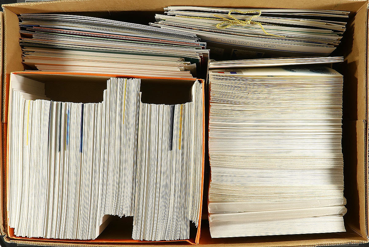 Copy box packed with First Day Covers, presentation cards and annual folders from all three offices, mostly 1960’s to 1991. There is a very complete run of about 1300 first day covers (ending around 1983) neatly sorted by office and then chronologically. Most are unaddressed with an ArtCraft cachet, including the "Flag" issues (up to 20c - with 16 larger FDCs with full panes of 16) and air mail issues. Where there is duplication, it is because there is a single on one cover and a block on another. The annual folders run up to 1991, with only a couple missing. There are at least 50 presentation cards, some mint, some with stamp with a first day cancel (includes some duplication), and a small stockbook with a mint collection back to the first New York issue. Its tidy organization will make for an easy integration into your collection or stock. Estimate =