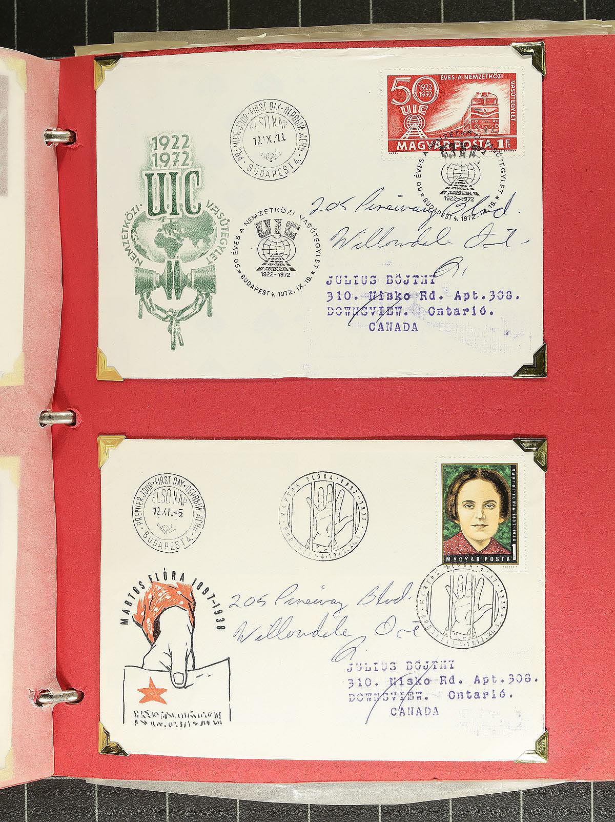 First Day Cover Collection 1963-1976. Approximately 150 cachet First Day Cover, all neatly mounted on colourful pages crammed into a bulging 3" binder. While the album has seen better days, there is a wealth of issues inside, all seemingly from collector in Downsview, Ontario (from the addresses on the envelopes). A very colourful period of Hungarian issues, with many full sets, souvenir sheets and even some imperforate issues. One of the best showing of topical stamps on covers we have seen, with notable sets that feature space, autos, sports, butterflies, flowers etc. Estimate =