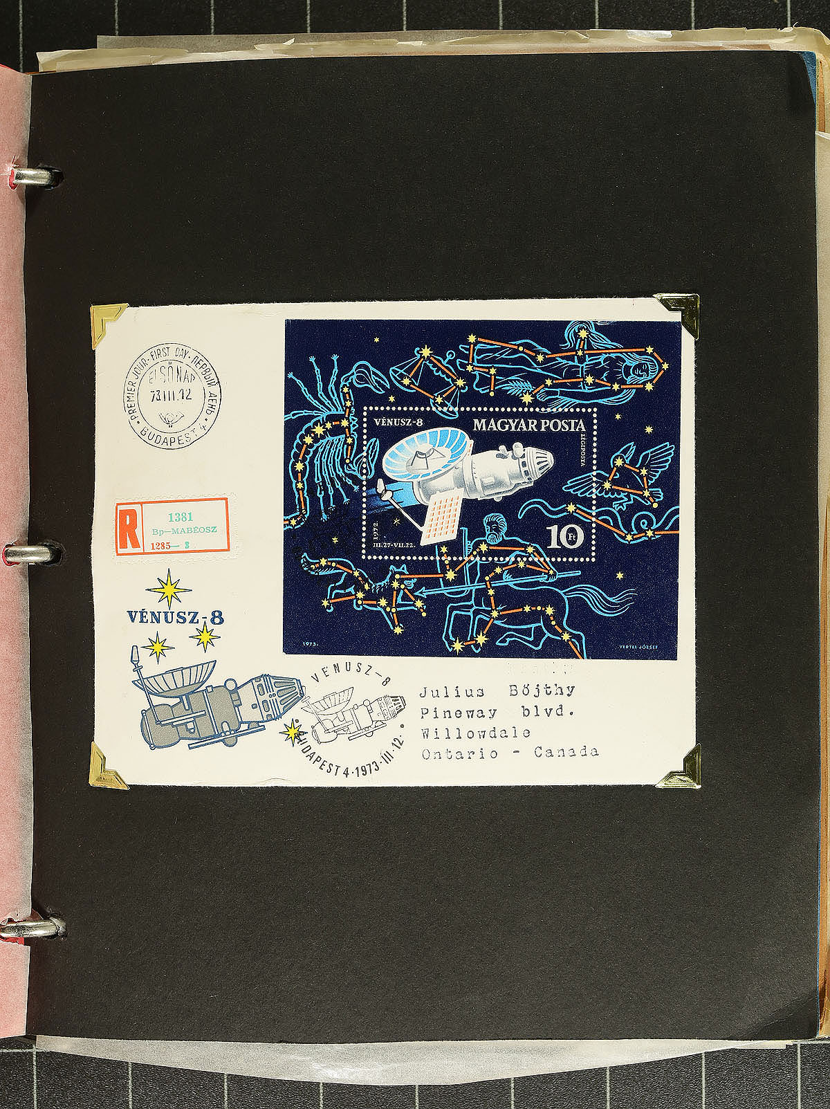 First Day Cover Collection 1963-1976. Approximately 150 cachet First Day Cover, all neatly mounted on colourful pages crammed into a bulging 3" binder. While the album has seen better days, there is a wealth of issues inside, all seemingly from collector in Downsview, Ontario (from the addresses on the envelopes). A very colourful period of Hungarian issues, with many full sets, souvenir sheets and even some imperforate issues. One of the best showing of topical stamps on covers we have seen, with notable sets that feature space, autos, sports, butterflies, flowers etc. Estimate =