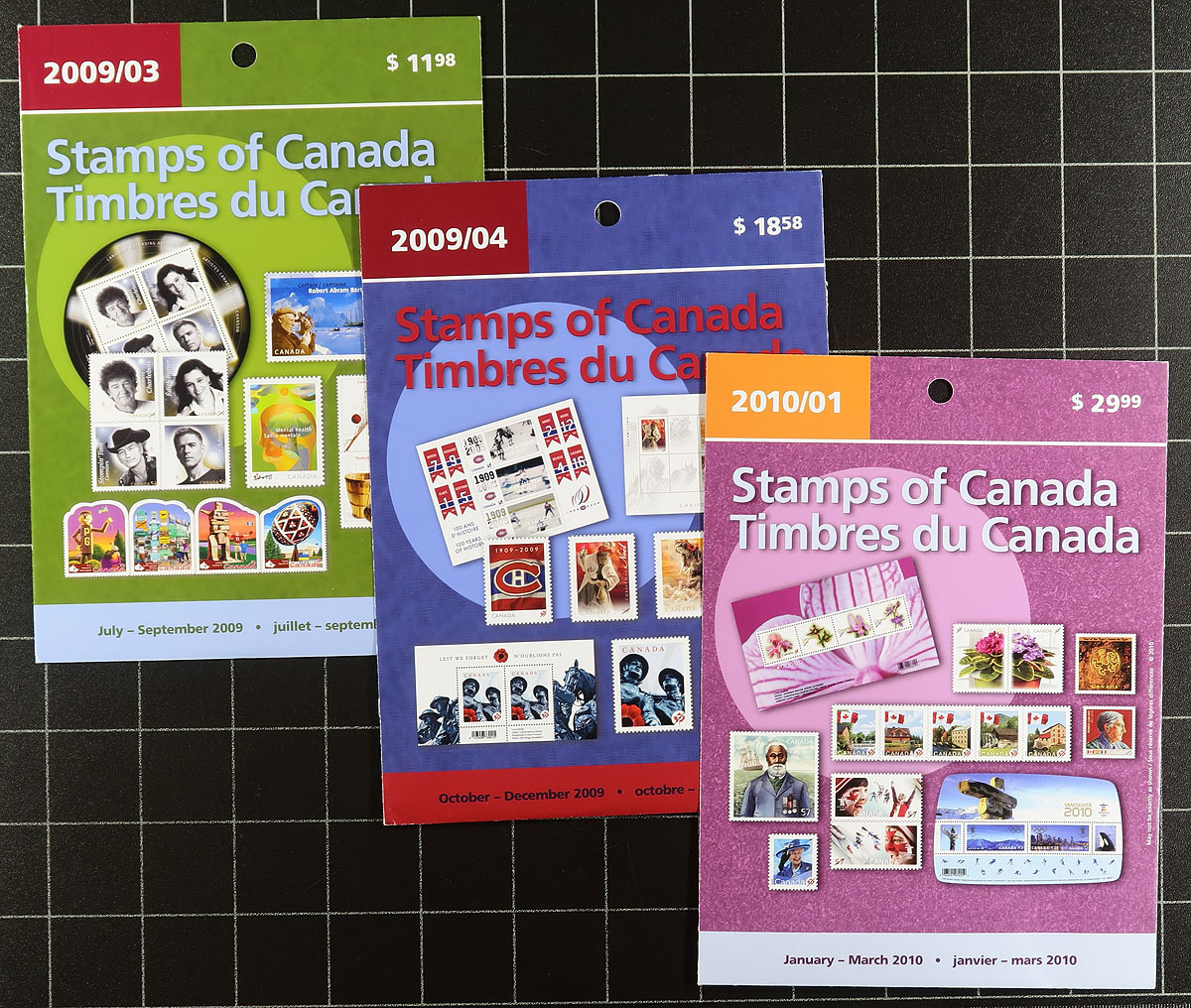 Quarterly Packs. Unopened and VF condition selection of ten different Canada Post new issue Quarterly Packs, consisting of 2007 (#2, #3); 2008 (#1, #2, #4); 2009 (#1, #2, #3, #4); 2010 (#1). These packs are chock full of the scarce premium value die-cut self-adhesive singles and other items only available in Canada Post Philatelic products. There are also numerous "P" (permanent) stamps in the packs, which have present face values that are far higher than when they were issued. The lot is conservatively valued at the basic face value issue price (considerably higher now). Total original face value =