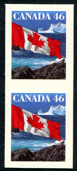 VF mint Never Hinged (self-adhesive) vertical imperforate pair of the 1998 issue 46c "Flag over Iceberg", which would have originally come from a booklet missing the die-cutting. 2024 Unitrade =