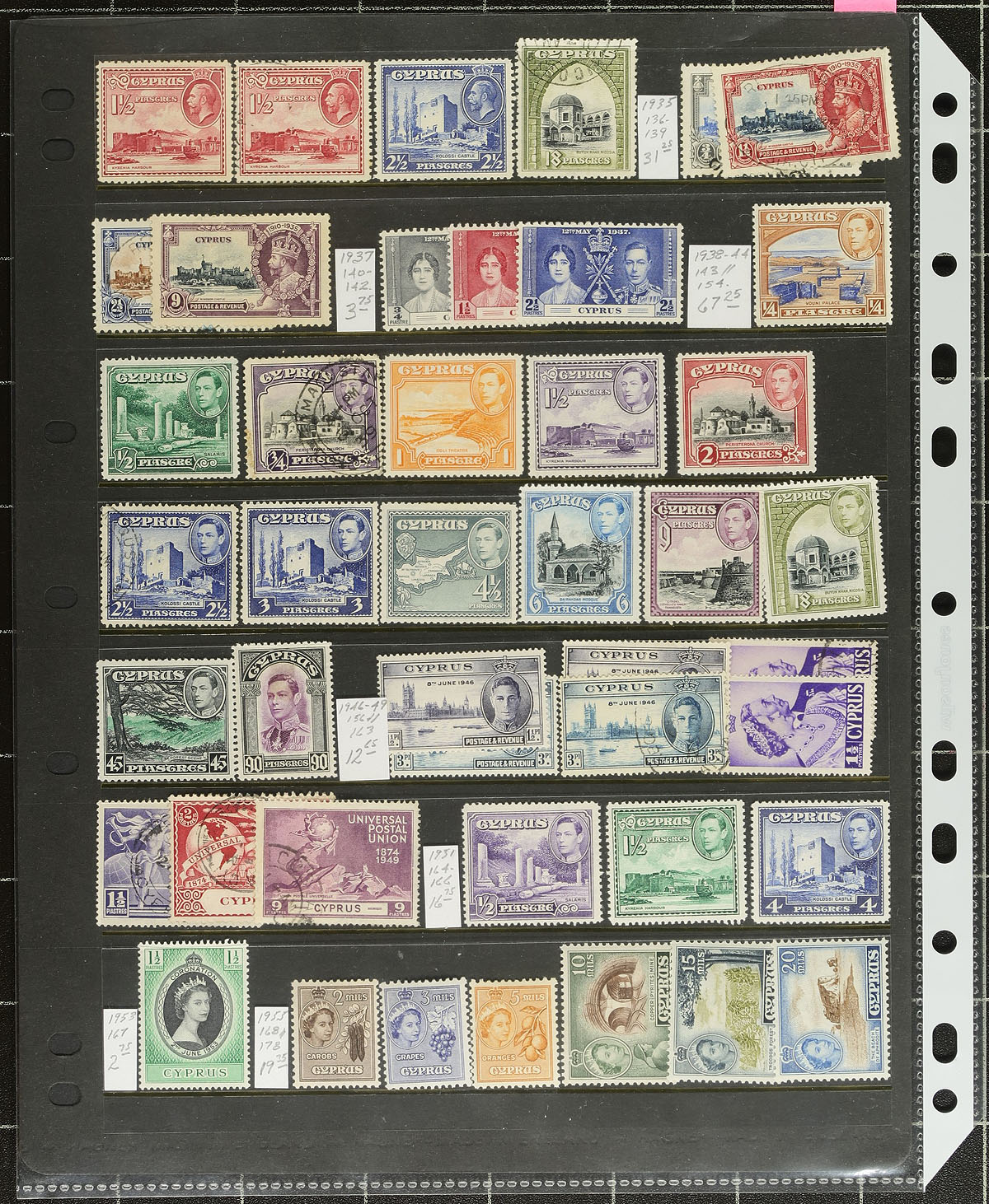 Collection of mint and used Cyprus, 1880-1987, containing roughly 375 stamps on 18 Vario-style or homemade pages. The collection ranges from Scott #1/688, with the majority of the value contained on the first two pages noting better stamps with #s 1 (x2, mh, pl. 15, c.v. $250 total), 2 (x5, mh, pl. 215-218, $128 total), 8 (mh, pl. 201, $115), 10 (x2, mh, pl. 215, 218, c.v. $170 total), along with a few singles, sets, and partial sets cataloguing $10 to $30 and up. A nice lot for the Commonwealth collector. 2025 Scott US$1,629.00 =