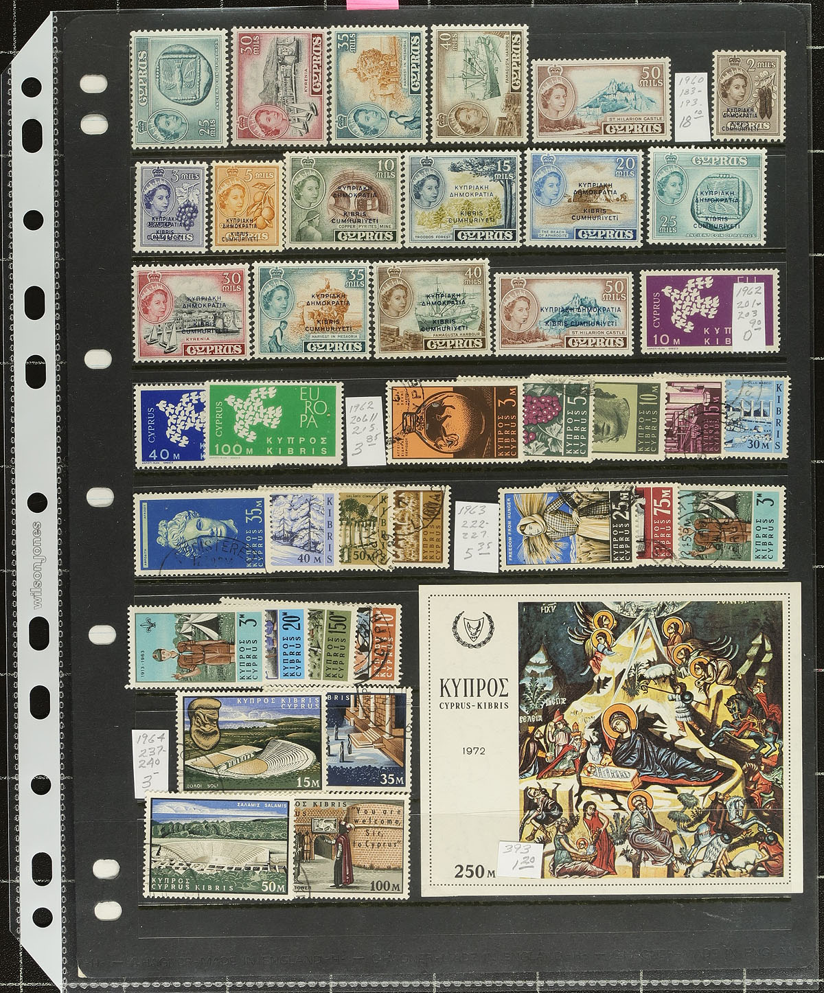 Collection of mint and used Cyprus, 1880-1987, containing roughly 375 stamps on 18 Vario-style or homemade pages. The collection ranges from Scott #1/688, with the majority of the value contained on the first two pages noting better stamps with #s 1 (x2, mh, pl. 15, c.v. $250 total), 2 (x5, mh, pl. 215-218, $128 total), 8 (mh, pl. 201, $115), 10 (x2, mh, pl. 215, 218, c.v. $170 total), along with a few singles, sets, and partial sets cataloguing $10 to $30 and up. A nice lot for the Commonwealth collector. 2025 Scott US$1,629.00 =