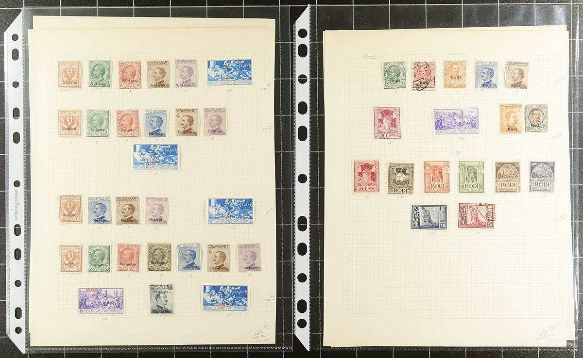 Collection of mint and used Italian Aegean Islands, containing 215 stamps on 12 album and homemade pages, with better representation from Caso, Nisiros, Rhodes, and more. The collection also includes a selection of mint and used Italian Colonies issues. Each page has owners notations for Scott number and current catalogue values, noting singles, and partial sets cataloguing in the $5 to $15 range and up. A nice grouping of these popular issues. All pages shown online. 2025 Scott US$977.00 =