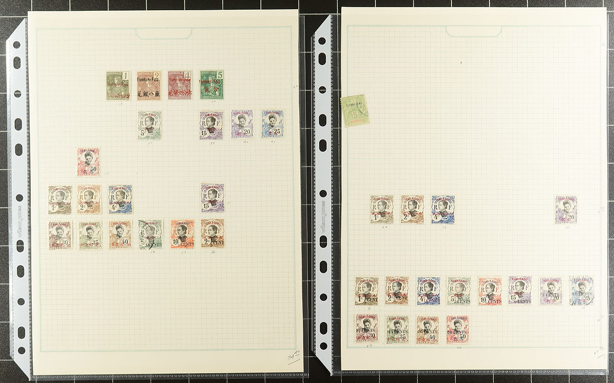 Group of roughly 150 mint and used French Offices in China, 1894-1920's, on 8 homemade pages, with better representation from Canton, Hoi Hao, Kouang-Tcheou, Tchong-King, Yunnan Fou and more. The majority of stamps have been identified by the owner, and includes current catalogue pricing, with some stamps and partial sets cataloguing in the $5 to $20 and up range. A nice group of these popular issues, a few faults on a few of the stamps, with all pages shown online. 2026 Scott US$703.00 =