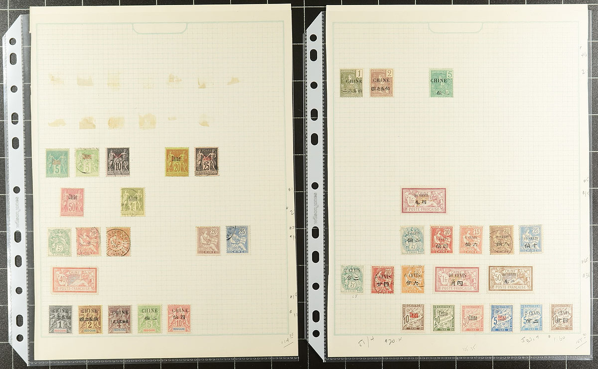 Group of roughly 150 mint and used French Offices in China, 1894-1920's, on 8 homemade pages, with better representation from Canton, Hoi Hao, Kouang-Tcheou, Tchong-King, Yunnan Fou and more. The majority of stamps have been identified by the owner, and includes current catalogue pricing, with some stamps and partial sets cataloguing in the $5 to $20 and up range. A nice group of these popular issues, a few faults on a few of the stamps, with all pages shown online. 2026 Scott US$703.00 =