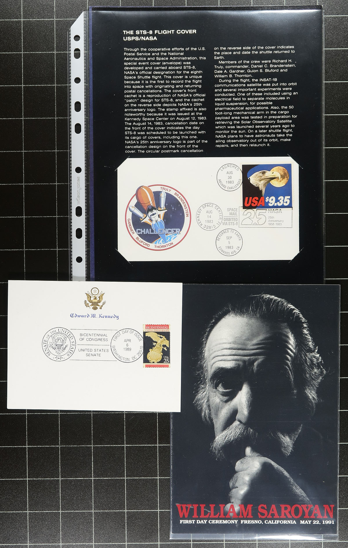 Group of roughly 150 United States covers, noting a good range of material including first day covers (including hand drawn/painted cachets), first flight covers, event covers, paquebot covers, commemorative covers, space related post cards, and more. The majority of material tends to range from the 1930's to the 1990's, with material possible on either side of the given range. A nice grouping that should appeal to cover collectors, or dealers for interesting dollar box items. Estimate =