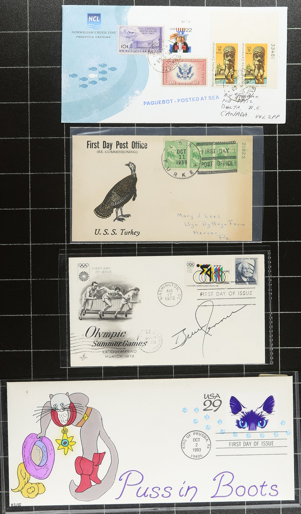 Group of roughly 150 United States covers, noting a good range of material including first day covers (including hand drawn/painted cachets), first flight covers, event covers, paquebot covers, commemorative covers, space related post cards, and more. The majority of material tends to range from the 1930's to the 1990's, with material possible on either side of the given range. A nice grouping that should appeal to cover collectors, or dealers for interesting dollar box items. Estimate =