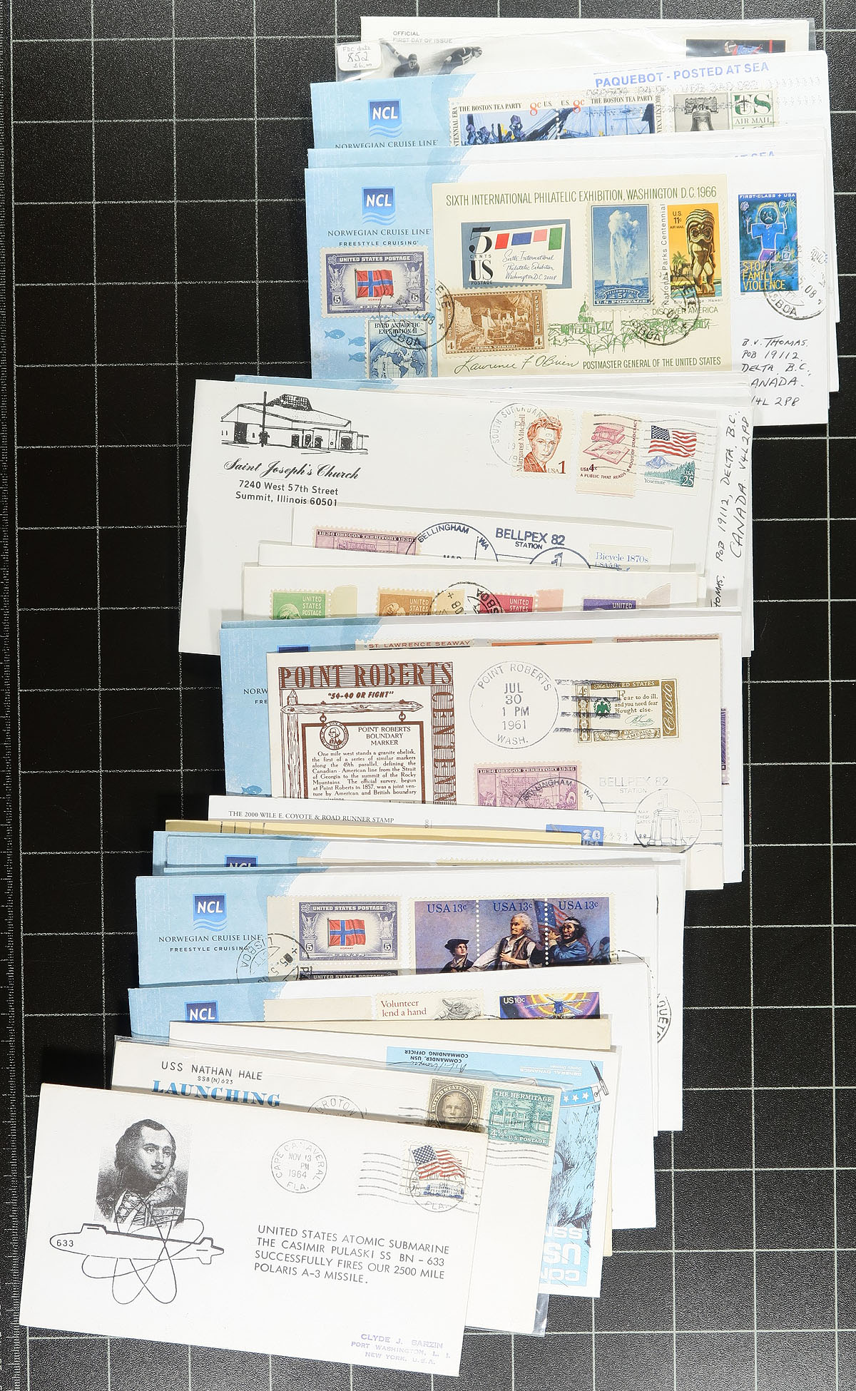 Group of roughly 150 United States covers, noting a good range of material including first day covers (including hand drawn/painted cachets), first flight covers, event covers, paquebot covers, commemorative covers, space related post cards, and more. The majority of material tends to range from the 1930's to the 1990's, with material possible on either side of the given range. A nice grouping that should appeal to cover collectors, or dealers for interesting dollar box items. Estimate =