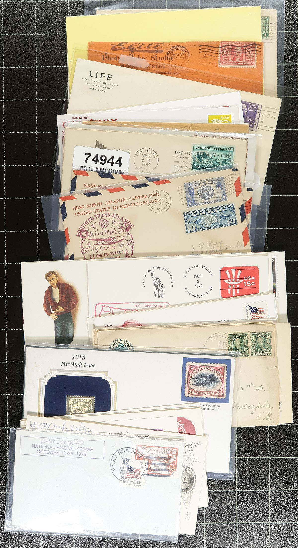 Group of roughly 150 United States covers, noting a good range of material including first day covers (including hand drawn/painted cachets), first flight covers, event covers, paquebot covers, commemorative covers, space related post cards, and more. The majority of material tends to range from the 1930's to the 1990's, with material possible on either side of the given range. A nice grouping that should appeal to cover collectors, or dealers for interesting dollar box items. Estimate =