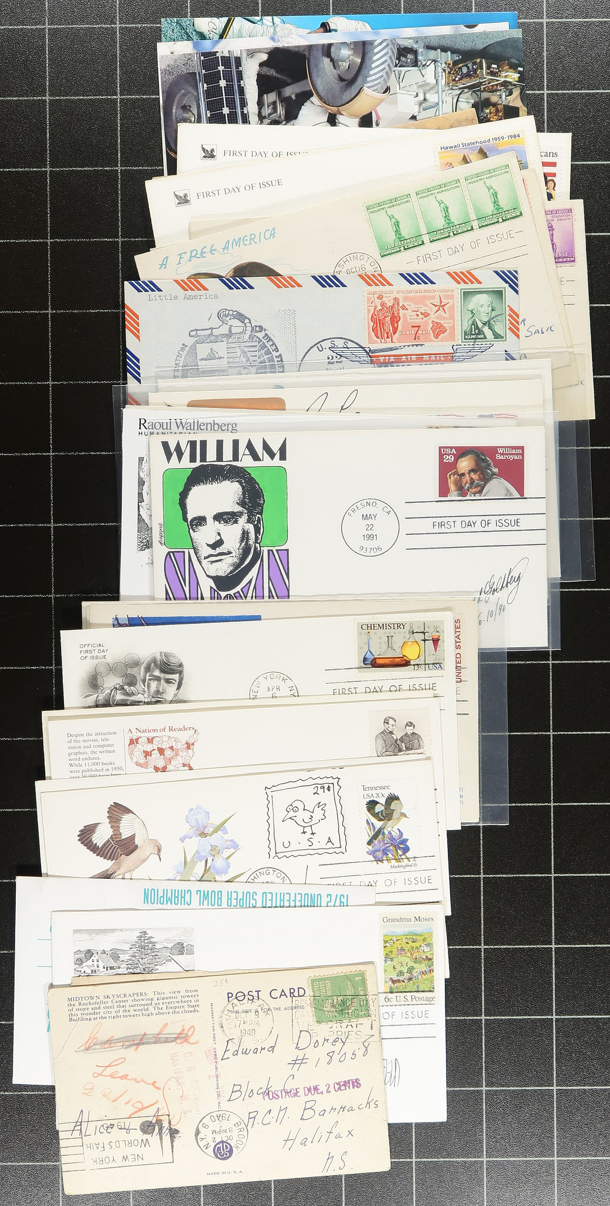 Group of roughly 150 United States covers, noting a good range of material including first day covers (including hand drawn/painted cachets), first flight covers, event covers, paquebot covers, commemorative covers, space related post cards, and more. The majority of material tends to range from the 1930's to the 1990's, with material possible on either side of the given range. A nice grouping that should appeal to cover collectors, or dealers for interesting dollar box items. Estimate =