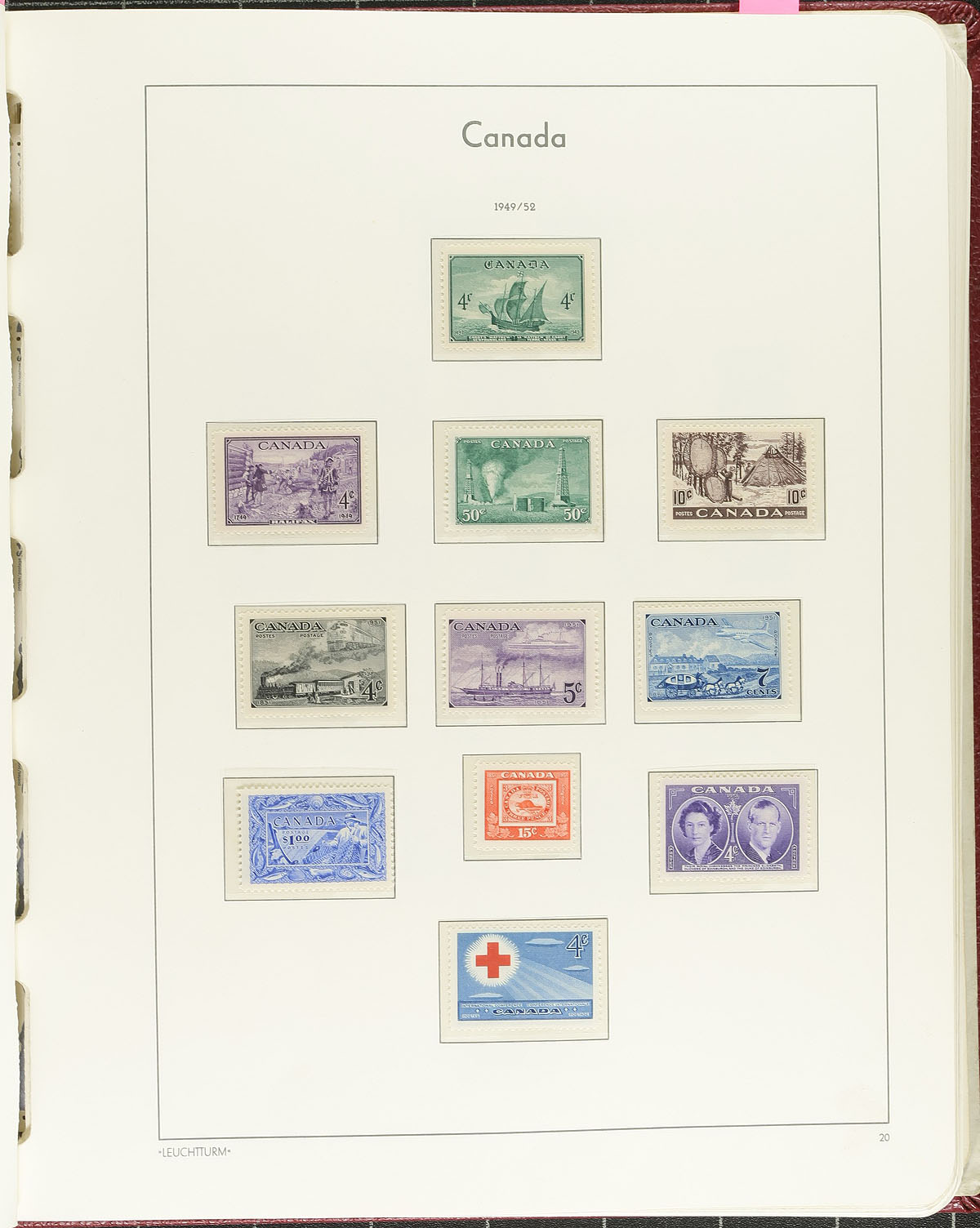 Collection of primarily mint Canada in a Lighthouse hingeless album, with slipcase, while the pages go back to 1851, the stamps start in 1897 and run to the 1970's. Contains a few hundred stamps beginning with a few Jubilees, Leafs, Numerals, Quebecs, and Edwards, with the majority of material starting with sets and partial sets of Admirals, Scrolls, Arch, Pictorials, War, and Peace issues. A spot check indicated primarily mint hinged material including a few never hinged, lightly hinged, and no gum stamps. A few of the stamps, sets, and partial sets catalogue in the $20 to $40 and up range. A few small faults with a few of the stamps, still a nice starter collection, in a lovely Lighthouse album. Estimate =