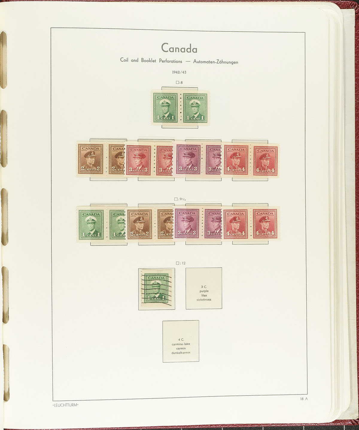 Collection of primarily mint Canada in a Lighthouse hingeless album, with slipcase, while the pages go back to 1851, the stamps start in 1897 and run to the 1970's. Contains a few hundred stamps beginning with a few Jubilees, Leafs, Numerals, Quebecs, and Edwards, with the majority of material starting with sets and partial sets of Admirals, Scrolls, Arch, Pictorials, War, and Peace issues. A spot check indicated primarily mint hinged material including a few never hinged, lightly hinged, and no gum stamps. A few of the stamps, sets, and partial sets catalogue in the $20 to $40 and up range. A few small faults with a few of the stamps, still a nice starter collection, in a lovely Lighthouse album. Estimate =