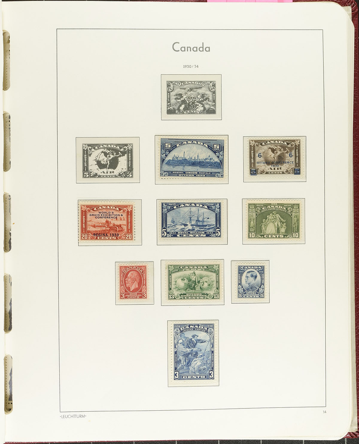 Collection of primarily mint Canada in a Lighthouse hingeless album, with slipcase, while the pages go back to 1851, the stamps start in 1897 and run to the 1970's. Contains a few hundred stamps beginning with a few Jubilees, Leafs, Numerals, Quebecs, and Edwards, with the majority of material starting with sets and partial sets of Admirals, Scrolls, Arch, Pictorials, War, and Peace issues. A spot check indicated primarily mint hinged material including a few never hinged, lightly hinged, and no gum stamps. A few of the stamps, sets, and partial sets catalogue in the $20 to $40 and up range. A few small faults with a few of the stamps, still a nice starter collection, in a lovely Lighthouse album. Estimate =