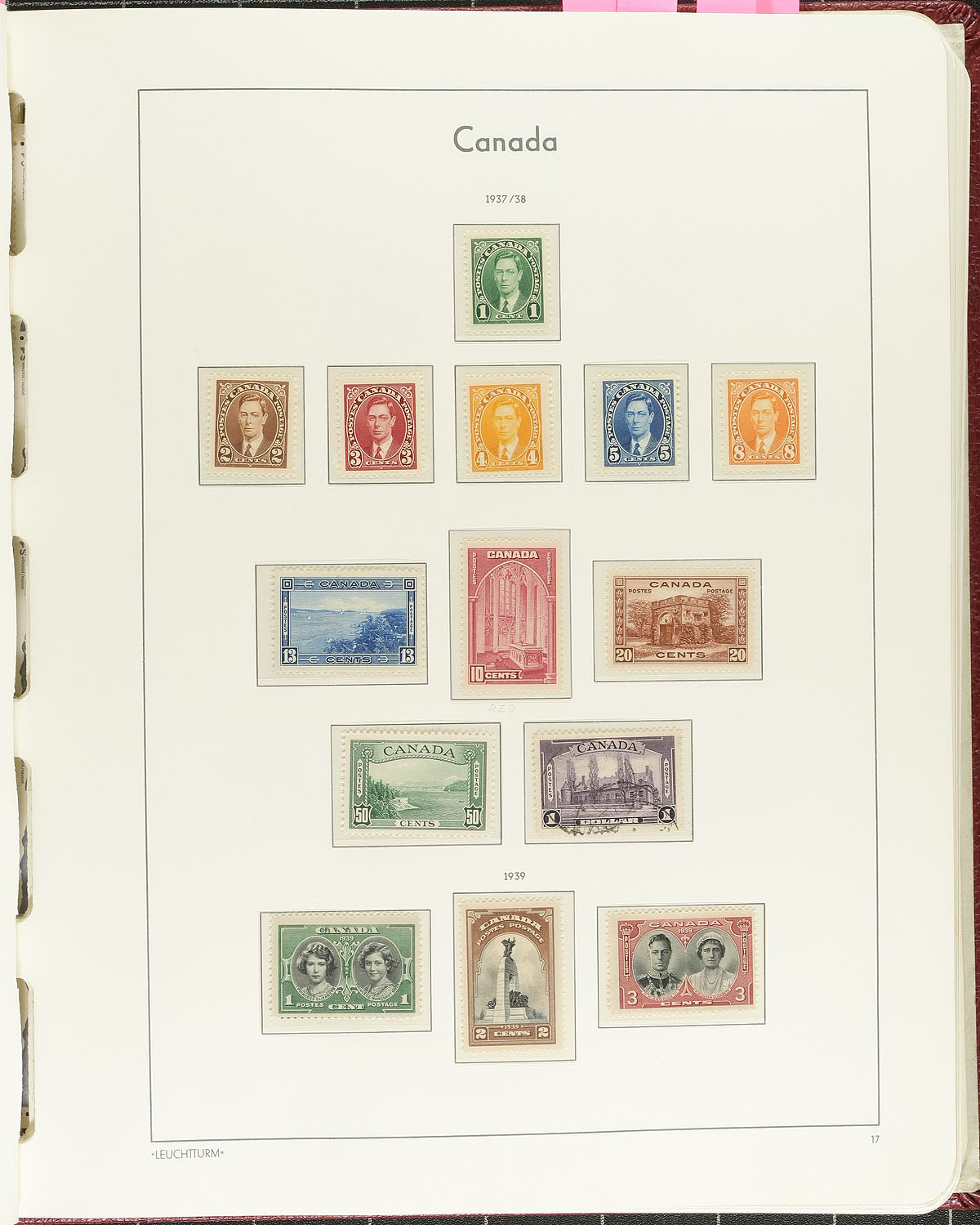 Collection of primarily mint Canada in a Lighthouse hingeless album, with slipcase, while the pages go back to 1851, the stamps start in 1897 and run to the 1970's. Contains a few hundred stamps beginning with a few Jubilees, Leafs, Numerals, Quebecs, and Edwards, with the majority of material starting with sets and partial sets of Admirals, Scrolls, Arch, Pictorials, War, and Peace issues. A spot check indicated primarily mint hinged material including a few never hinged, lightly hinged, and no gum stamps. A few of the stamps, sets, and partial sets catalogue in the $20 to $40 and up range. A few small faults with a few of the stamps, still a nice starter collection, in a lovely Lighthouse album. Estimate =