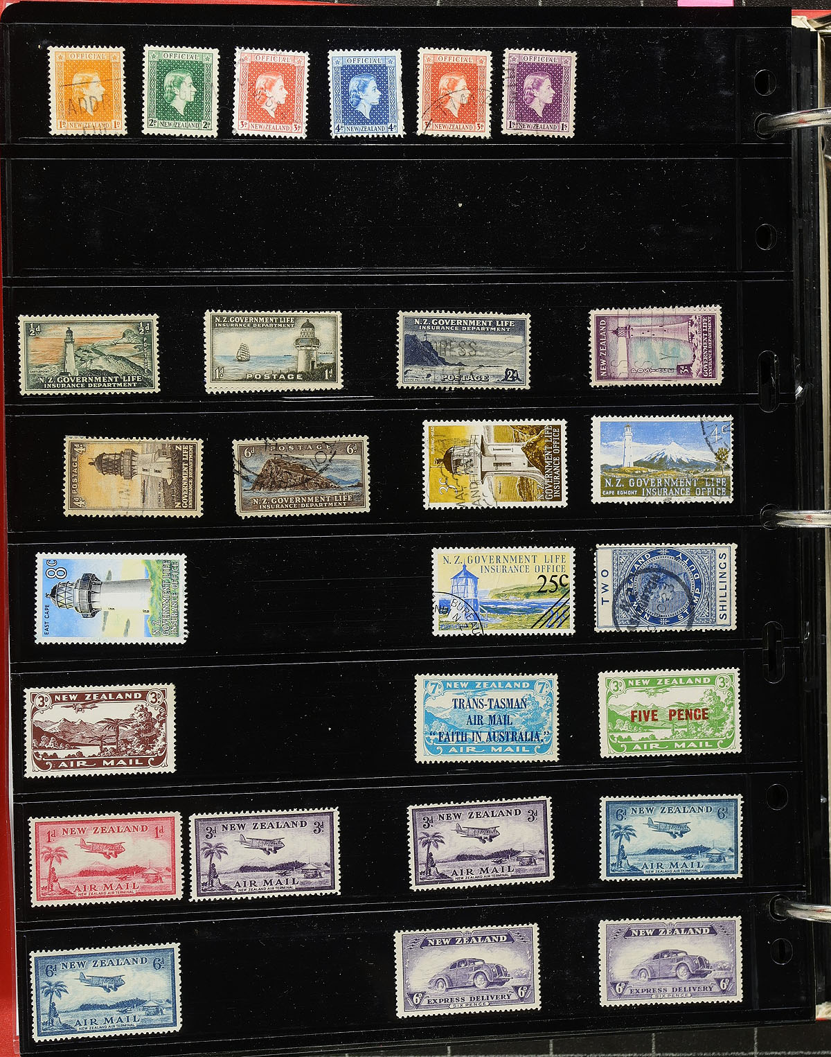 Large collection of mint and used New Zealand, 1880's-2010's, containing a few thousand stamps, in roughly 100 double sided Vario-style stockpages housed in a thick binder. The collection begins with a run of used singles, sets, and partial sets, generally ranging from the 1880's up to the early 2000's, and then continues with a mint portion (which appears to be the majority of this collection), from the 1980's up to the 2010's. The lot also includes, used officials, mint and used health issues, blocks, several souvenir sheets and more. We estimate several hundreds of dollars in face value material, with singles and sets cataloguing in the $5 to $15 and up range. A spot check indicated the mint material being hinged in 2-3 spots per stamp. Still a nice grouping for the New Zealand collector, or potential postal user. The Vario pages alone would retail a few hundred dollars in total. Our online photos show a small sample only. Estimate =