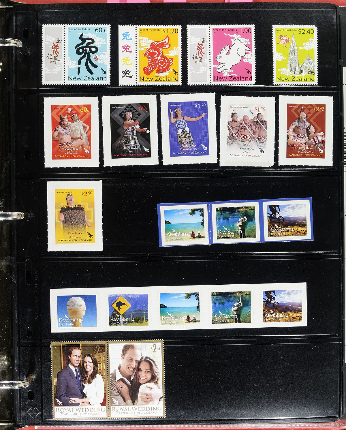 Large collection of mint and used New Zealand, 1880's-2010's, containing a few thousand stamps, in roughly 100 double sided Vario-style stockpages housed in a thick binder. The collection begins with a run of used singles, sets, and partial sets, generally ranging from the 1880's up to the early 2000's, and then continues with a mint portion (which appears to be the majority of this collection), from the 1980's up to the 2010's. The lot also includes, used officials, mint and used health issues, blocks, several souvenir sheets and more. We estimate several hundreds of dollars in face value material, with singles and sets cataloguing in the $5 to $15 and up range. A spot check indicated the mint material being hinged in 2-3 spots per stamp. Still a nice grouping for the New Zealand collector, or potential postal user. The Vario pages alone would retail a few hundred dollars in total. Our online photos show a small sample only. Estimate =