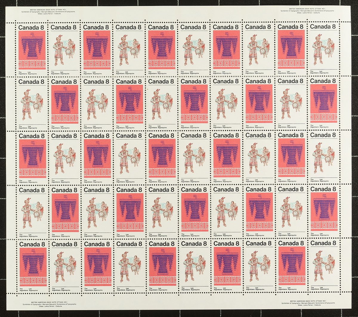 Complete VF MNH sheets of 50 of the 1973 8c "Algonkians", one on regular paper, the other on the transparent hibrite. Also note the "red dot above elbow" variety (position 28) on the regular sheet. Nice to get complete sheets of both the listed paper types. 2024 Unitrade =