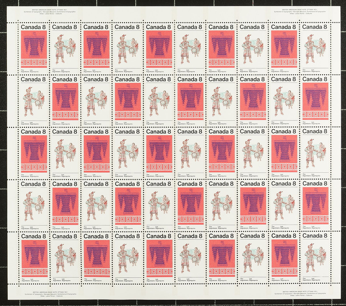 Complete VF MNH sheets of 50 of the 1973 8c "Algonkians", one on regular paper, the other on the transparent hibrite. Also note the "red dot above elbow" variety (position 28) on the regular sheet. Nice to get complete sheets of both the listed paper types. 2024 Unitrade =