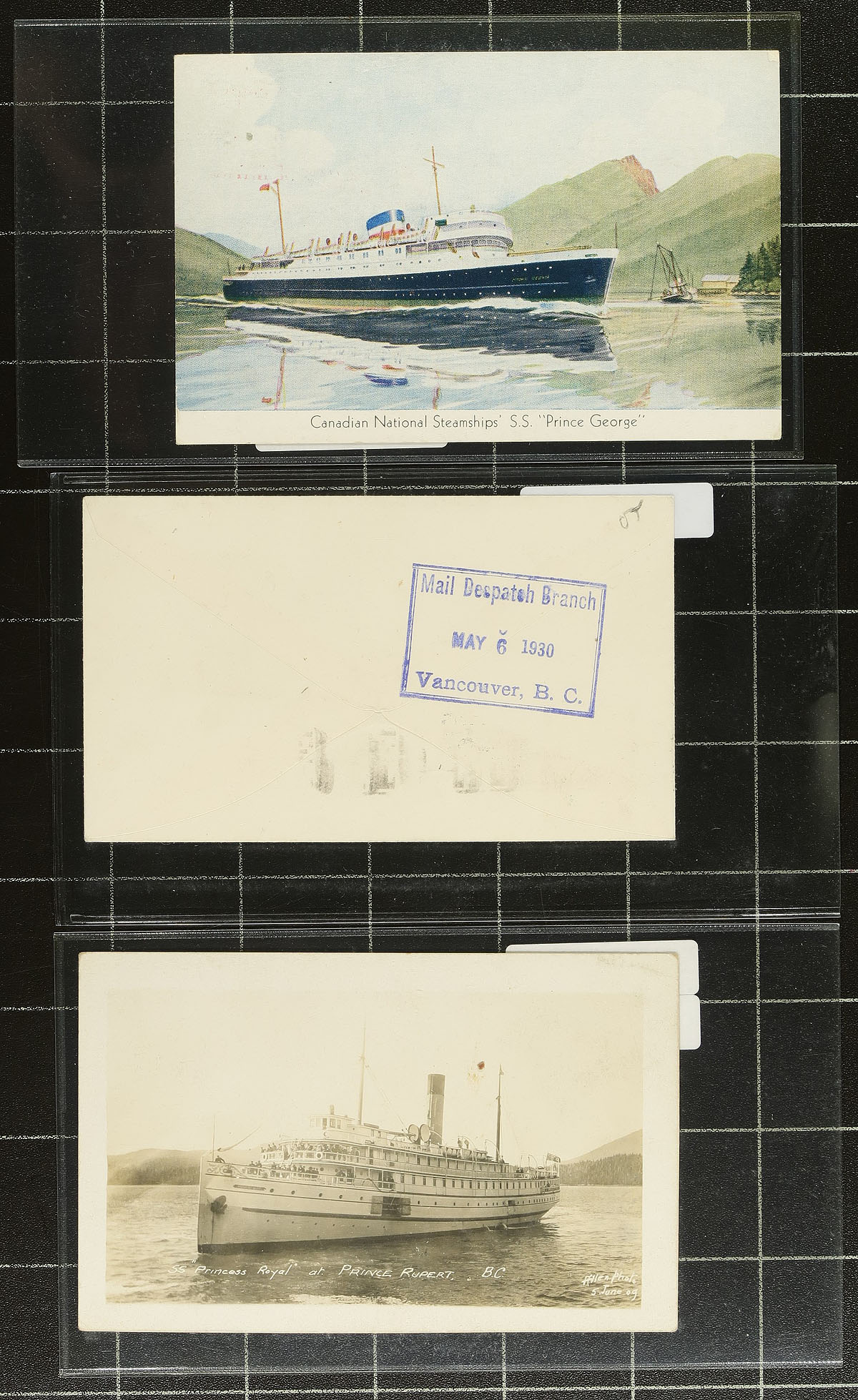 British Columbia Coastal Steamship Markings. A choice trio of items posted aboard coastal steamships, including SS Prince George 1945 (Purser's Office) boxed postmark, Steamer Princess Alice 1930 (Vancouver-Skagway RPO oval) and lastly, Str. Princess Beatrice 1911 (oval). The latter of the items is quite interesting, as the postmark is dated 4 months earlier than Topping lists in his book (and the picture side is a Real Photo Postcard of the SS Princess Royal). Each item is individually sleeved and priced from when the original owner bought these. Total retail as marked =