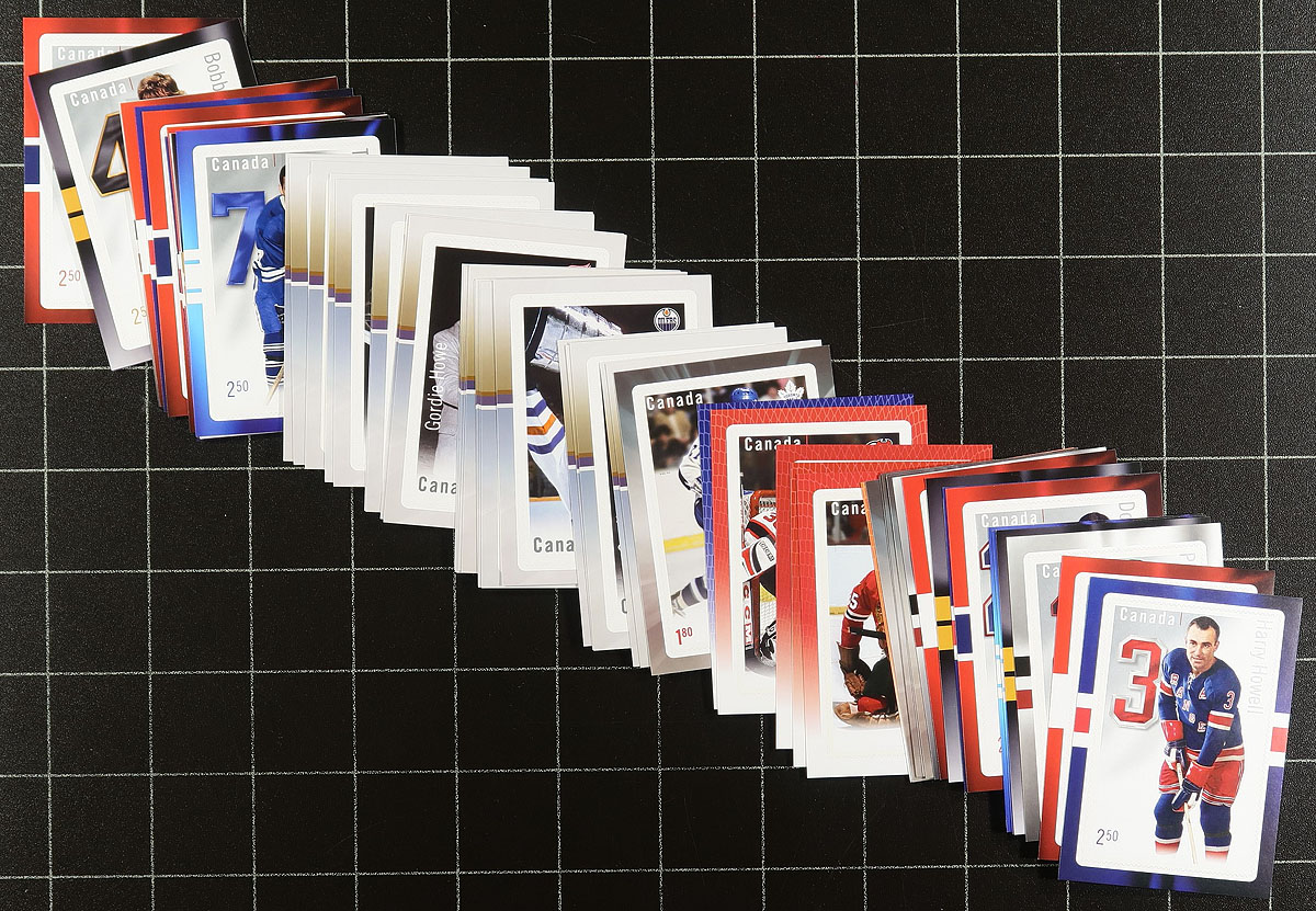 Modern Mint "Hockey Card" selection of 60 stamps, including 24x $2.50 issues and 36x $1.80 issues, with some duplication. These self-adhesive stamps, stylized to mimic a sports card was one of the most innovative and novel ideas of the 21st century in Canadian stamp issuance (in our humble opinion). Face value alone is $124.80. 2024 Unitrade =