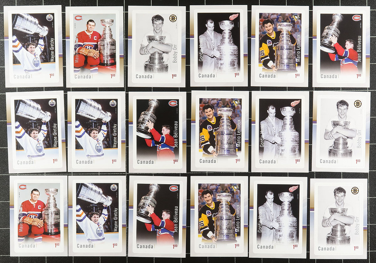 Modern Mint "Hockey Card" selection of 60 stamps, including 24x $2.50 issues and 36x $1.80 issues, with some duplication. These self-adhesive stamps, stylized to mimic a sports card was one of the most innovative and novel ideas of the 21st century in Canadian stamp issuance (in our humble opinion). Face value alone is $124.80. 2024 Unitrade =