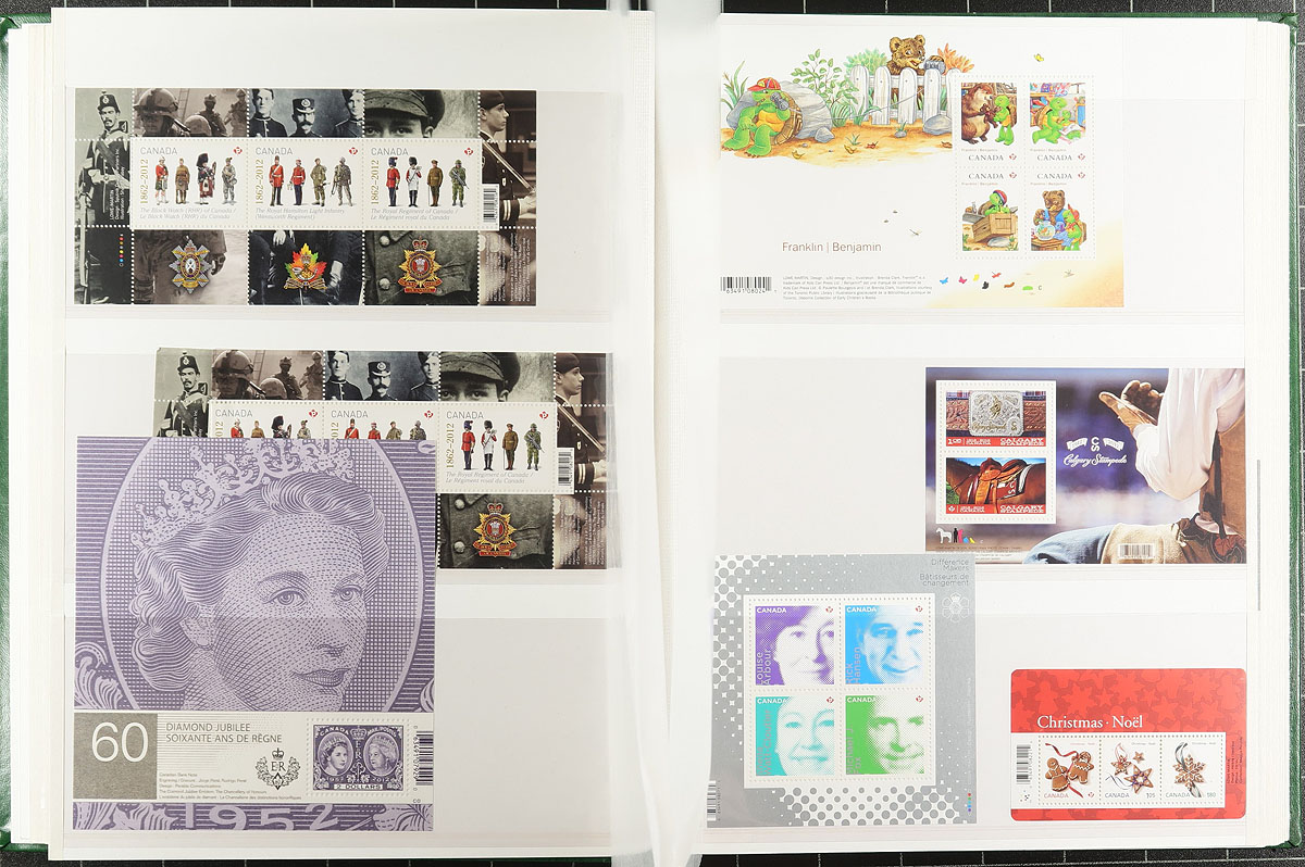 Modern Postage Medley. A duo of 32-page Unisafe brand stockbooks, containing a wild-ride of Never Hinged stamps from the 1970's to 2015 (with the vast majority being post-2000). Includes many better items such as souvenir sheets, panes, $10.00 Whale, $2.00 QEII Jubilee and MANY "P" stamps (even noticed a couple FDC). Conservatively valued for the total usable postage only. Total face value =