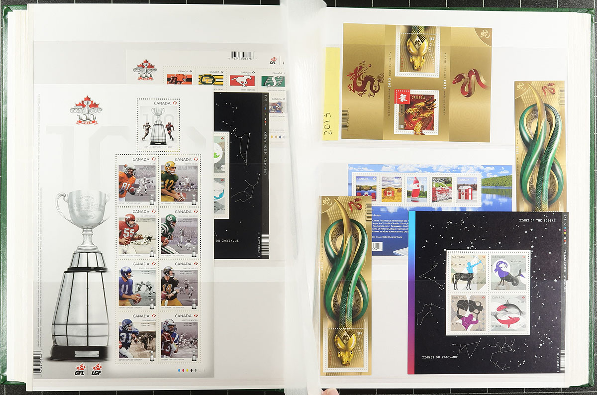 Modern Postage Medley. A duo of 32-page Unisafe brand stockbooks, containing a wild-ride of Never Hinged stamps from the 1970's to 2015 (with the vast majority being post-2000). Includes many better items such as souvenir sheets, panes, $10.00 Whale, $2.00 QEII Jubilee and MANY "P" stamps (even noticed a couple FDC). Conservatively valued for the total usable postage only. Total face value =