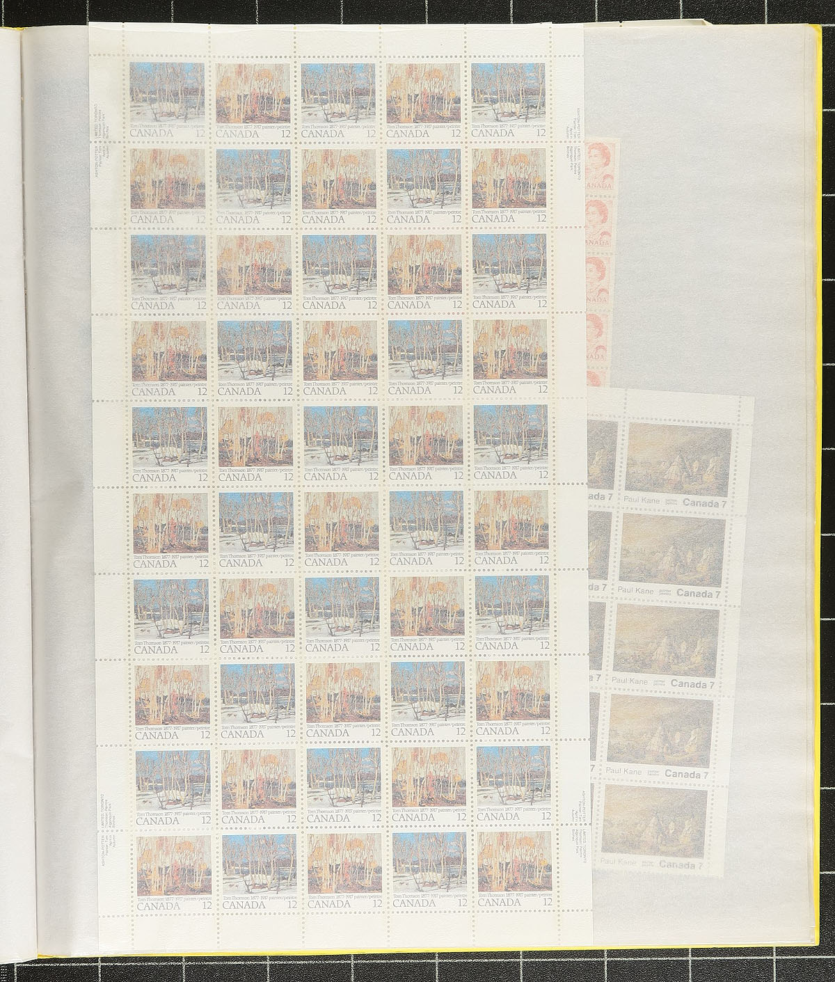 Mint Sheet Holding. A mint sheet file, filled with 1960's to 1980's mint sheets, with better including the 1969 Transatlantic Flight Anniversary, Floral series definitives, Tree series definitives, 50c / 75c / 80c Street Scenes, $1.00 Fundy, $2.00 Kluane, 1977 Silver Jubilee etc. A few partial sheets from older stamps (1930's / 1940's) also noted "for the record". Over 40 complete sheets, plus the extras! Conservatively valued for the total usable postage value alone. Total face value =
