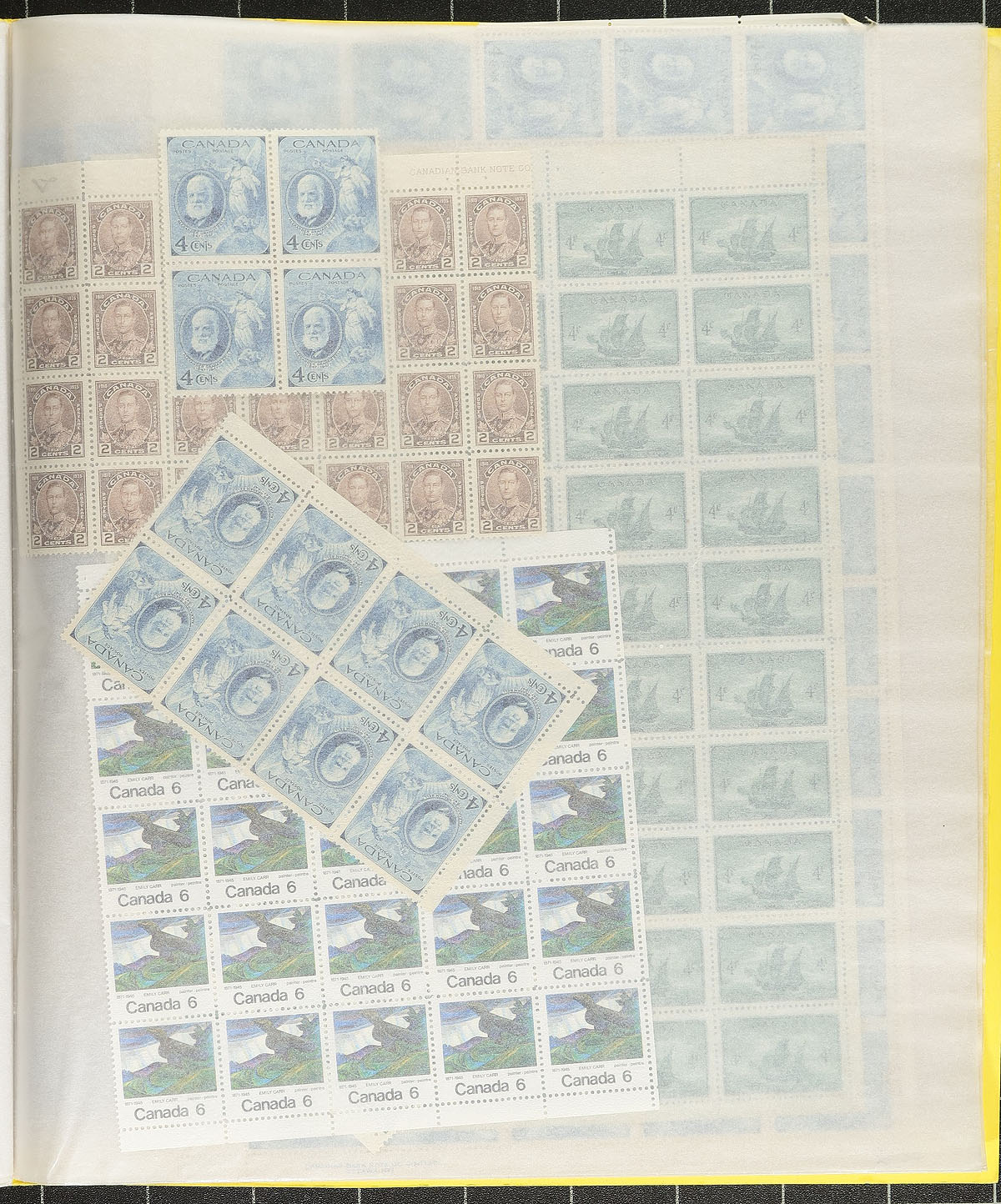 Mint Sheet Holding. A mint sheet file, filled with 1960's to 1980's mint sheets, with better including the 1969 Transatlantic Flight Anniversary, Floral series definitives, Tree series definitives, 50c / 75c / 80c Street Scenes, $1.00 Fundy, $2.00 Kluane, 1977 Silver Jubilee etc. A few partial sheets from older stamps (1930's / 1940's) also noted "for the record". Over 40 complete sheets, plus the extras! Conservatively valued for the total usable postage value alone. Total face value =
