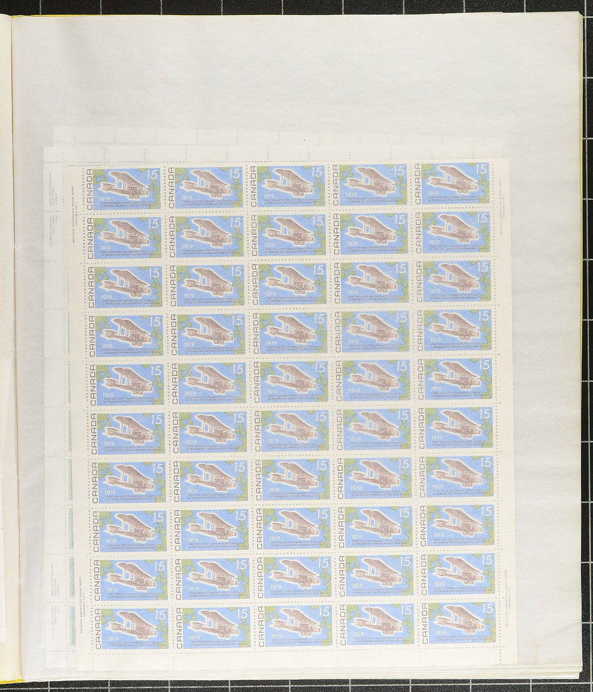 Mint Sheet Holding. A mint sheet file, filled with 1960's to 1980's mint sheets, with better including the 1969 Transatlantic Flight Anniversary, Floral series definitives, Tree series definitives, 50c / 75c / 80c Street Scenes, $1.00 Fundy, $2.00 Kluane, 1977 Silver Jubilee etc. A few partial sheets from older stamps (1930's / 1940's) also noted "for the record". Over 40 complete sheets, plus the extras! Conservatively valued for the total usable postage value alone. Total face value =