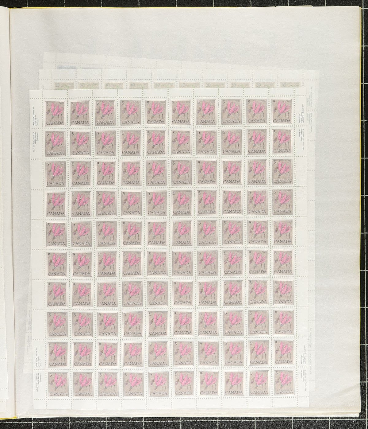 Mint Sheet Holding. A mint sheet file, filled with 1960's to 1980's mint sheets, with better including the 1969 Transatlantic Flight Anniversary, Floral series definitives, Tree series definitives, 50c / 75c / 80c Street Scenes, $1.00 Fundy, $2.00 Kluane, 1977 Silver Jubilee etc. A few partial sheets from older stamps (1930's / 1940's) also noted "for the record". Over 40 complete sheets, plus the extras! Conservatively valued for the total usable postage value alone. Total face value =