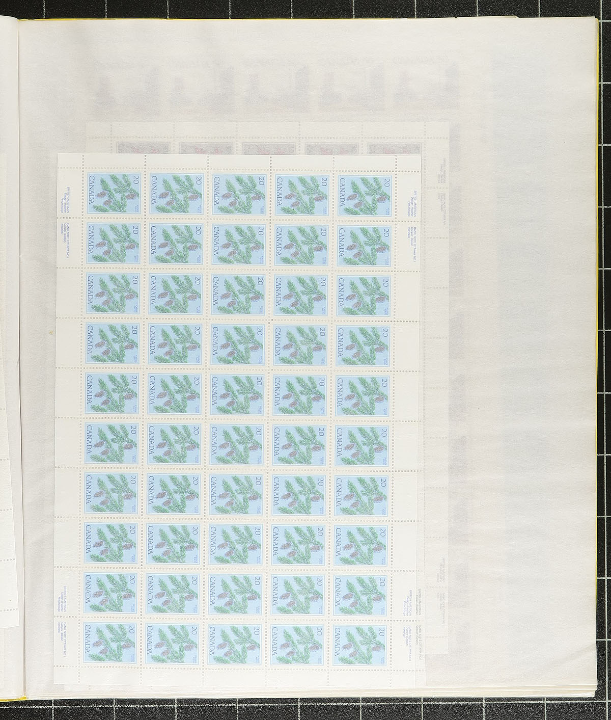 Mint Sheet Holding. A mint sheet file, filled with 1960's to 1980's mint sheets, with better including the 1969 Transatlantic Flight Anniversary, Floral series definitives, Tree series definitives, 50c / 75c / 80c Street Scenes, $1.00 Fundy, $2.00 Kluane, 1977 Silver Jubilee etc. A few partial sheets from older stamps (1930's / 1940's) also noted "for the record". Over 40 complete sheets, plus the extras! Conservatively valued for the total usable postage value alone. Total face value =