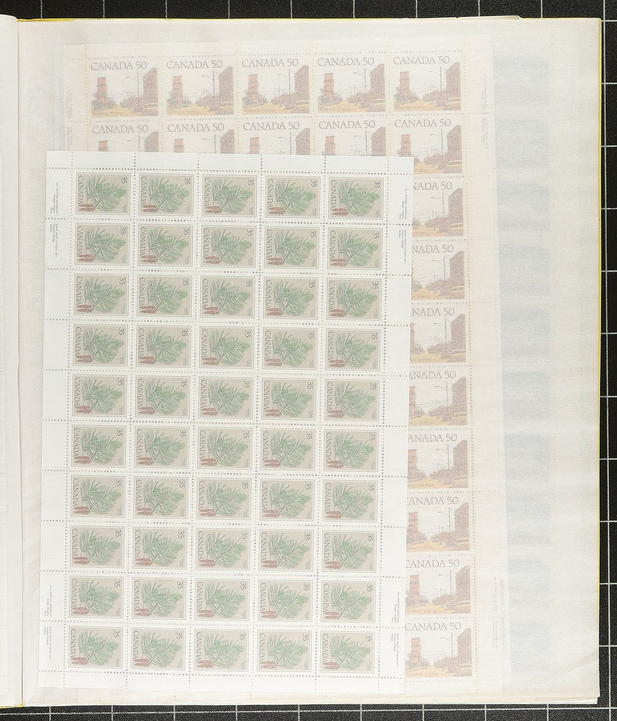 Mint Sheet Holding. A mint sheet file, filled with 1960's to 1980's mint sheets, with better including the 1969 Transatlantic Flight Anniversary, Floral series definitives, Tree series definitives, 50c / 75c / 80c Street Scenes, $1.00 Fundy, $2.00 Kluane, 1977 Silver Jubilee etc. A few partial sheets from older stamps (1930's / 1940's) also noted "for the record". Over 40 complete sheets, plus the extras! Conservatively valued for the total usable postage value alone. Total face value =