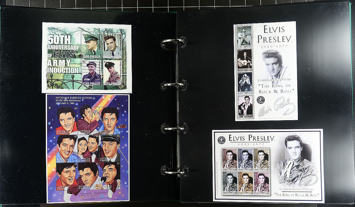 Part 1 - "United States" and "A" to "P" countries, with some "St. Vincent" in large 50 page full-sheet UniSafe four-ring binder with matching green slipcase (retail $140.00). A comprehensive, mint Never Hinged exhibit and collection of singles (a few are gold leaf high value singles), sets (including complete sets where Elvis was only one of the artists being commemorated), souvenir sheets, occasional maxi-card, first day cover, imperforate variety plus some progressive proofs. Cleanly laid out, comprehensive and with enormous initial cost ($200.00 for the proofs alone) with almost everything else easily have costing $5-$20 per set. Countries includes Albania, Antigua & Barbuda, Bhutan, Burkina Faso, Chad, Congo, Dominica, Gambia, Germany, Guinea-Bissau, Ghana, Grenada (& Grenadines), Guyana, Kurdistan, Liberia, Madagascar, Malagasy, Maldives, Marshall Islands, Micronesia, Mongolia, Nevis, Palau and Papua New Guinea. A total of 68 "world" stamps (+ 76 from the American issue, including a complete sheet), 159 souvenir sheets/sheetlets, 12 covers and 16 plate proofs pairs. Estimate =