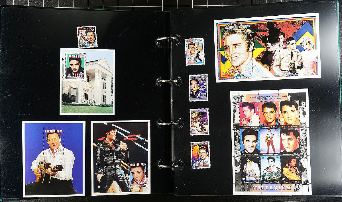 Part 1 - "United States" and "A" to "P" countries, with some "St. Vincent" in large 50 page full-sheet UniSafe four-ring binder with matching green slipcase (retail $140.00). A comprehensive, mint Never Hinged exhibit and collection of singles (a few are gold leaf high value singles), sets (including complete sets where Elvis was only one of the artists being commemorated), souvenir sheets, occasional maxi-card, first day cover, imperforate variety plus some progressive proofs. Cleanly laid out, comprehensive and with enormous initial cost ($200.00 for the proofs alone) with almost everything else easily have costing $5-$20 per set. Countries includes Albania, Antigua & Barbuda, Bhutan, Burkina Faso, Chad, Congo, Dominica, Gambia, Germany, Guinea-Bissau, Ghana, Grenada (& Grenadines), Guyana, Kurdistan, Liberia, Madagascar, Malagasy, Maldives, Marshall Islands, Micronesia, Mongolia, Nevis, Palau and Papua New Guinea. A total of 68 "world" stamps (+ 76 from the American issue, including a complete sheet), 159 souvenir sheets/sheetlets, 12 covers and 16 plate proofs pairs. Estimate =