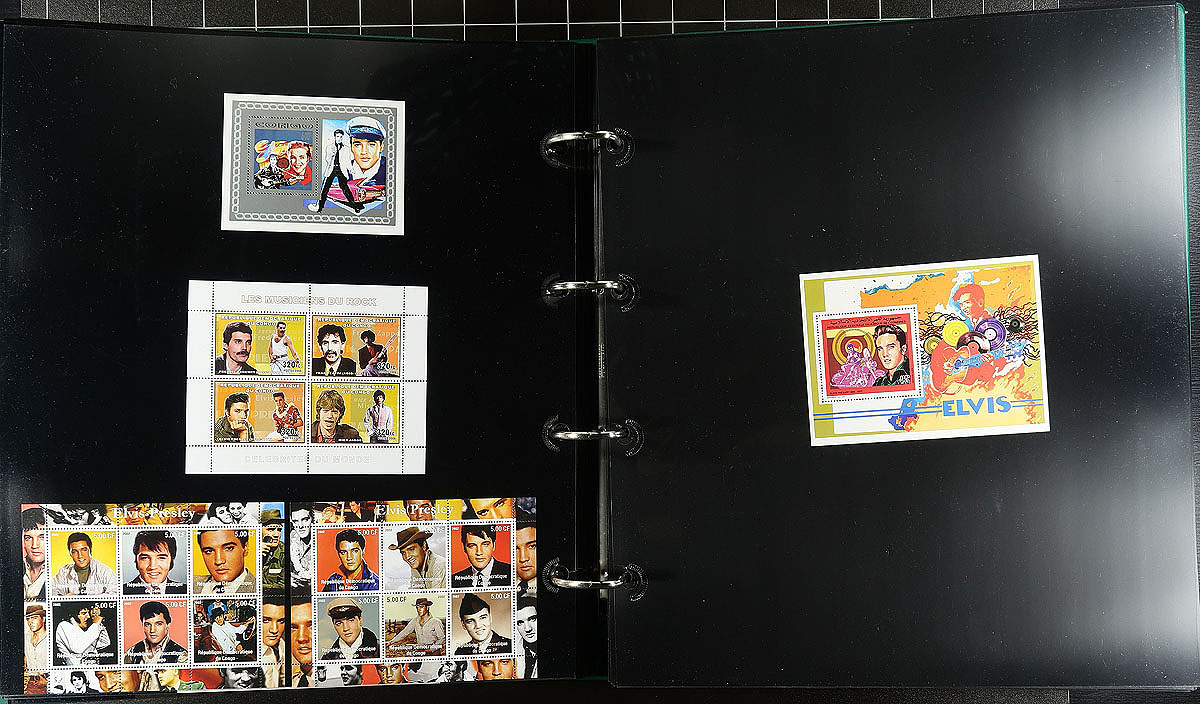 Part 1 - "United States" and "A" to "P" countries, with some "St. Vincent" in large 50 page full-sheet UniSafe four-ring binder with matching green slipcase (retail $140.00). A comprehensive, mint Never Hinged exhibit and collection of singles (a few are gold leaf high value singles), sets (including complete sets where Elvis was only one of the artists being commemorated), souvenir sheets, occasional maxi-card, first day cover, imperforate variety plus some progressive proofs. Cleanly laid out, comprehensive and with enormous initial cost ($200.00 for the proofs alone) with almost everything else easily have costing $5-$20 per set. Countries includes Albania, Antigua & Barbuda, Bhutan, Burkina Faso, Chad, Congo, Dominica, Gambia, Germany, Guinea-Bissau, Ghana, Grenada (& Grenadines), Guyana, Kurdistan, Liberia, Madagascar, Malagasy, Maldives, Marshall Islands, Micronesia, Mongolia, Nevis, Palau and Papua New Guinea. A total of 68 "world" stamps (+ 76 from the American issue, including a complete sheet), 159 souvenir sheets/sheetlets, 12 covers and 16 plate proofs pairs. Estimate =