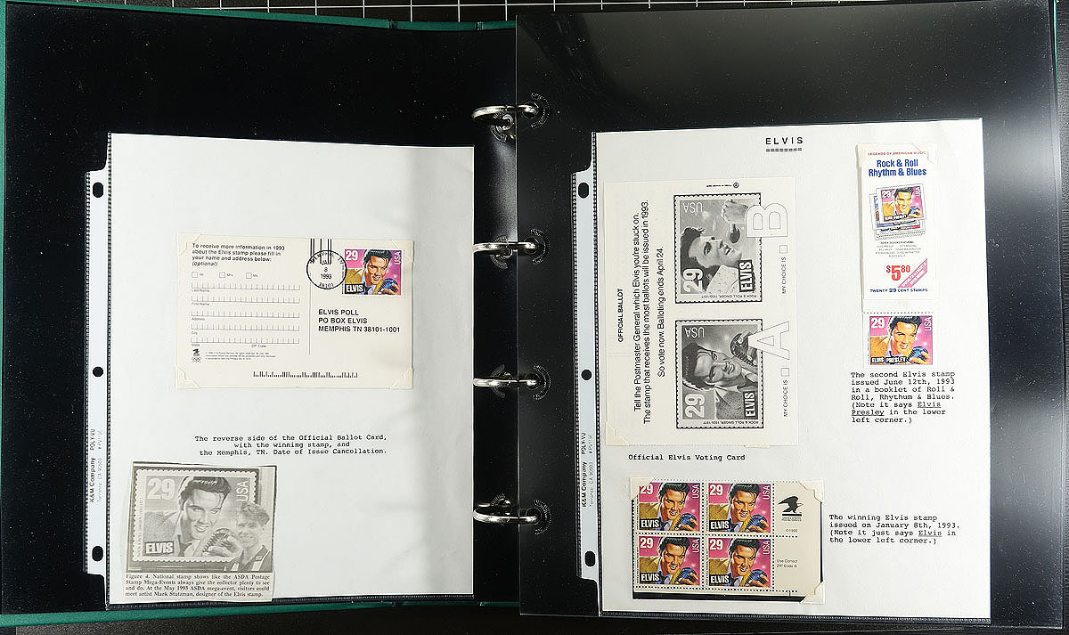 Part 1 - "United States" and "A" to "P" countries, with some "St. Vincent" in large 50 page full-sheet UniSafe four-ring binder with matching green slipcase (retail $140.00). A comprehensive, mint Never Hinged exhibit and collection of singles (a few are gold leaf high value singles), sets (including complete sets where Elvis was only one of the artists being commemorated), souvenir sheets, occasional maxi-card, first day cover, imperforate variety plus some progressive proofs. Cleanly laid out, comprehensive and with enormous initial cost ($200.00 for the proofs alone) with almost everything else easily have costing $5-$20 per set. Countries includes Albania, Antigua & Barbuda, Bhutan, Burkina Faso, Chad, Congo, Dominica, Gambia, Germany, Guinea-Bissau, Ghana, Grenada (& Grenadines), Guyana, Kurdistan, Liberia, Madagascar, Malagasy, Maldives, Marshall Islands, Micronesia, Mongolia, Nevis, Palau and Papua New Guinea. A total of 68 "world" stamps (+ 76 from the American issue, including a complete sheet), 159 souvenir sheets/sheetlets, 12 covers and 16 plate proofs pairs. Estimate =