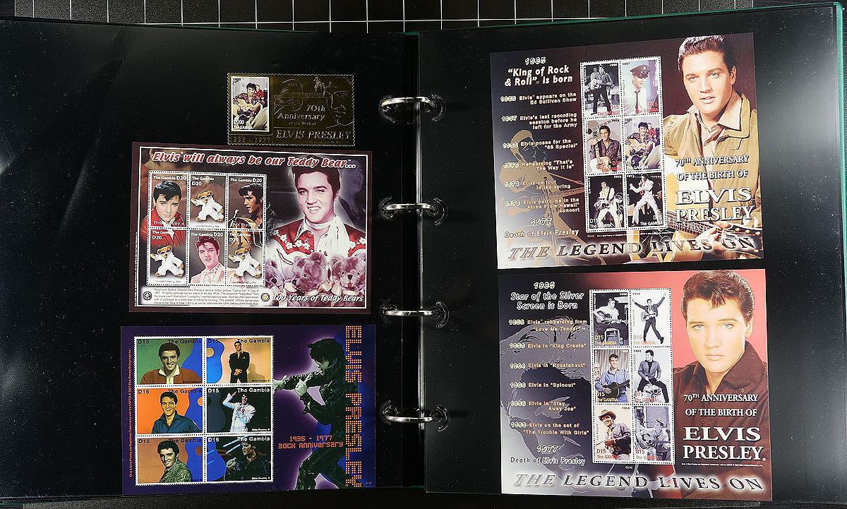Part 1 - "United States" and "A" to "P" countries, with some "St. Vincent" in large 50 page full-sheet UniSafe four-ring binder with matching green slipcase (retail $140.00). A comprehensive, mint Never Hinged exhibit and collection of singles (a few are gold leaf high value singles), sets (including complete sets where Elvis was only one of the artists being commemorated), souvenir sheets, occasional maxi-card, first day cover, imperforate variety plus some progressive proofs. Cleanly laid out, comprehensive and with enormous initial cost ($200.00 for the proofs alone) with almost everything else easily have costing $5-$20 per set. Countries includes Albania, Antigua & Barbuda, Bhutan, Burkina Faso, Chad, Congo, Dominica, Gambia, Germany, Guinea-Bissau, Ghana, Grenada (& Grenadines), Guyana, Kurdistan, Liberia, Madagascar, Malagasy, Maldives, Marshall Islands, Micronesia, Mongolia, Nevis, Palau and Papua New Guinea. A total of 68 "world" stamps (+ 76 from the American issue, including a complete sheet), 159 souvenir sheets/sheetlets, 12 covers and 16 plate proofs pairs. Estimate =