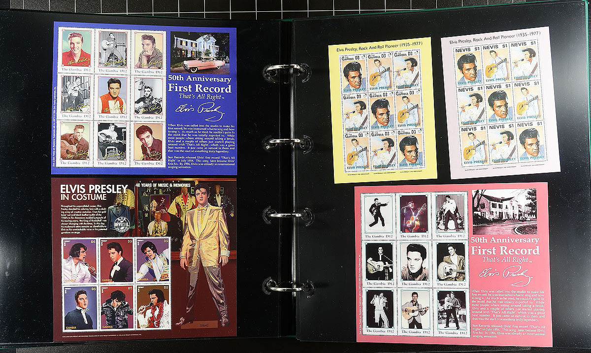 Part 1 - "United States" and "A" to "P" countries, with some "St. Vincent" in large 50 page full-sheet UniSafe four-ring binder with matching green slipcase (retail $140.00). A comprehensive, mint Never Hinged exhibit and collection of singles (a few are gold leaf high value singles), sets (including complete sets where Elvis was only one of the artists being commemorated), souvenir sheets, occasional maxi-card, first day cover, imperforate variety plus some progressive proofs. Cleanly laid out, comprehensive and with enormous initial cost ($200.00 for the proofs alone) with almost everything else easily have costing $5-$20 per set. Countries includes Albania, Antigua & Barbuda, Bhutan, Burkina Faso, Chad, Congo, Dominica, Gambia, Germany, Guinea-Bissau, Ghana, Grenada (& Grenadines), Guyana, Kurdistan, Liberia, Madagascar, Malagasy, Maldives, Marshall Islands, Micronesia, Mongolia, Nevis, Palau and Papua New Guinea. A total of 68 "world" stamps (+ 76 from the American issue, including a complete sheet), 159 souvenir sheets/sheetlets, 12 covers and 16 plate proofs pairs. Estimate =