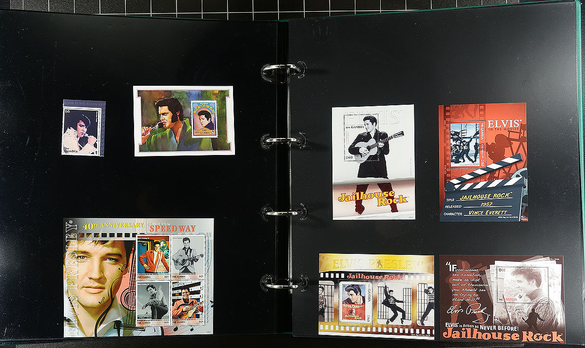 Part 1 - "United States" and "A" to "P" countries, with some "St. Vincent" in large 50 page full-sheet UniSafe four-ring binder with matching green slipcase (retail $140.00). A comprehensive, mint Never Hinged exhibit and collection of singles (a few are gold leaf high value singles), sets (including complete sets where Elvis was only one of the artists being commemorated), souvenir sheets, occasional maxi-card, first day cover, imperforate variety plus some progressive proofs. Cleanly laid out, comprehensive and with enormous initial cost ($200.00 for the proofs alone) with almost everything else easily have costing $5-$20 per set. Countries includes Albania, Antigua & Barbuda, Bhutan, Burkina Faso, Chad, Congo, Dominica, Gambia, Germany, Guinea-Bissau, Ghana, Grenada (& Grenadines), Guyana, Kurdistan, Liberia, Madagascar, Malagasy, Maldives, Marshall Islands, Micronesia, Mongolia, Nevis, Palau and Papua New Guinea. A total of 68 "world" stamps (+ 76 from the American issue, including a complete sheet), 159 souvenir sheets/sheetlets, 12 covers and 16 plate proofs pairs. Estimate =