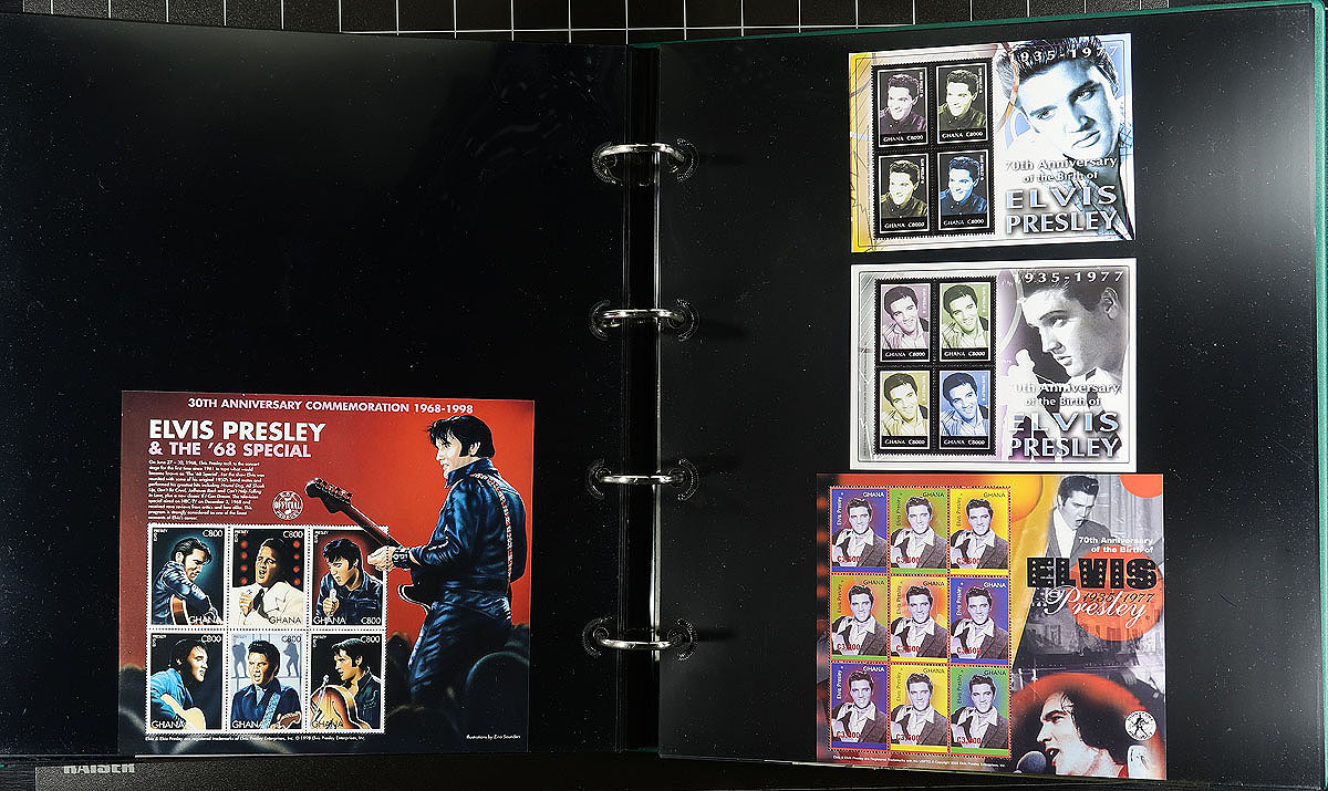 Part 1 - "United States" and "A" to "P" countries, with some "St. Vincent" in large 50 page full-sheet UniSafe four-ring binder with matching green slipcase (retail $140.00). A comprehensive, mint Never Hinged exhibit and collection of singles (a few are gold leaf high value singles), sets (including complete sets where Elvis was only one of the artists being commemorated), souvenir sheets, occasional maxi-card, first day cover, imperforate variety plus some progressive proofs. Cleanly laid out, comprehensive and with enormous initial cost ($200.00 for the proofs alone) with almost everything else easily have costing $5-$20 per set. Countries includes Albania, Antigua & Barbuda, Bhutan, Burkina Faso, Chad, Congo, Dominica, Gambia, Germany, Guinea-Bissau, Ghana, Grenada (& Grenadines), Guyana, Kurdistan, Liberia, Madagascar, Malagasy, Maldives, Marshall Islands, Micronesia, Mongolia, Nevis, Palau and Papua New Guinea. A total of 68 "world" stamps (+ 76 from the American issue, including a complete sheet), 159 souvenir sheets/sheetlets, 12 covers and 16 plate proofs pairs. Estimate =