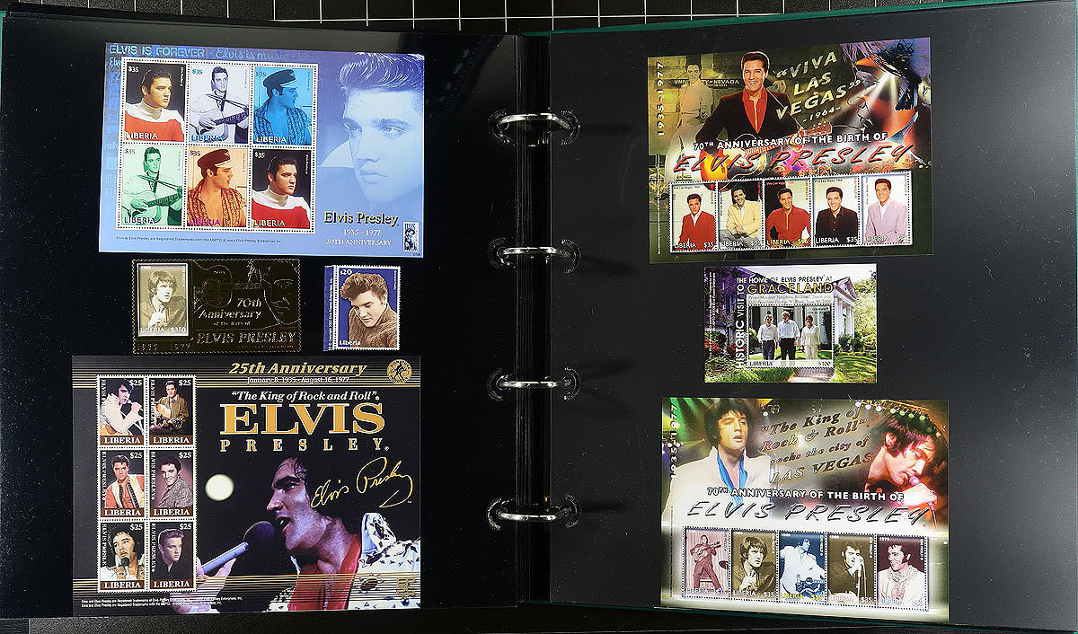 Part 1 - "United States" and "A" to "P" countries, with some "St. Vincent" in large 50 page full-sheet UniSafe four-ring binder with matching green slipcase (retail $140.00). A comprehensive, mint Never Hinged exhibit and collection of singles (a few are gold leaf high value singles), sets (including complete sets where Elvis was only one of the artists being commemorated), souvenir sheets, occasional maxi-card, first day cover, imperforate variety plus some progressive proofs. Cleanly laid out, comprehensive and with enormous initial cost ($200.00 for the proofs alone) with almost everything else easily have costing $5-$20 per set. Countries includes Albania, Antigua & Barbuda, Bhutan, Burkina Faso, Chad, Congo, Dominica, Gambia, Germany, Guinea-Bissau, Ghana, Grenada (& Grenadines), Guyana, Kurdistan, Liberia, Madagascar, Malagasy, Maldives, Marshall Islands, Micronesia, Mongolia, Nevis, Palau and Papua New Guinea. A total of 68 "world" stamps (+ 76 from the American issue, including a complete sheet), 159 souvenir sheets/sheetlets, 12 covers and 16 plate proofs pairs. Estimate =