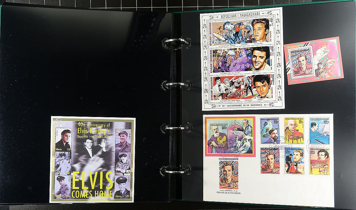 Part 1 - "United States" and "A" to "P" countries, with some "St. Vincent" in large 50 page full-sheet UniSafe four-ring binder with matching green slipcase (retail $140.00). A comprehensive, mint Never Hinged exhibit and collection of singles (a few are gold leaf high value singles), sets (including complete sets where Elvis was only one of the artists being commemorated), souvenir sheets, occasional maxi-card, first day cover, imperforate variety plus some progressive proofs. Cleanly laid out, comprehensive and with enormous initial cost ($200.00 for the proofs alone) with almost everything else easily have costing $5-$20 per set. Countries includes Albania, Antigua & Barbuda, Bhutan, Burkina Faso, Chad, Congo, Dominica, Gambia, Germany, Guinea-Bissau, Ghana, Grenada (& Grenadines), Guyana, Kurdistan, Liberia, Madagascar, Malagasy, Maldives, Marshall Islands, Micronesia, Mongolia, Nevis, Palau and Papua New Guinea. A total of 68 "world" stamps (+ 76 from the American issue, including a complete sheet), 159 souvenir sheets/sheetlets, 12 covers and 16 plate proofs pairs. Estimate =