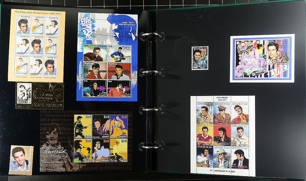 Part 1 - "United States" and "A" to "P" countries, with some "St. Vincent" in large 50 page full-sheet UniSafe four-ring binder with matching green slipcase (retail $140.00). A comprehensive, mint Never Hinged exhibit and collection of singles (a few are gold leaf high value singles), sets (including complete sets where Elvis was only one of the artists being commemorated), souvenir sheets, occasional maxi-card, first day cover, imperforate variety plus some progressive proofs. Cleanly laid out, comprehensive and with enormous initial cost ($200.00 for the proofs alone) with almost everything else easily have costing $5-$20 per set. Countries includes Albania, Antigua & Barbuda, Bhutan, Burkina Faso, Chad, Congo, Dominica, Gambia, Germany, Guinea-Bissau, Ghana, Grenada (& Grenadines), Guyana, Kurdistan, Liberia, Madagascar, Malagasy, Maldives, Marshall Islands, Micronesia, Mongolia, Nevis, Palau and Papua New Guinea. A total of 68 "world" stamps (+ 76 from the American issue, including a complete sheet), 159 souvenir sheets/sheetlets, 12 covers and 16 plate proofs pairs. Estimate =