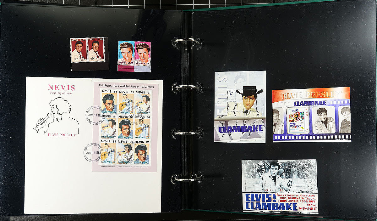 Part 1 - "United States" and "A" to "P" countries, with some "St. Vincent" in large 50 page full-sheet UniSafe four-ring binder with matching green slipcase (retail $140.00). A comprehensive, mint Never Hinged exhibit and collection of singles (a few are gold leaf high value singles), sets (including complete sets where Elvis was only one of the artists being commemorated), souvenir sheets, occasional maxi-card, first day cover, imperforate variety plus some progressive proofs. Cleanly laid out, comprehensive and with enormous initial cost ($200.00 for the proofs alone) with almost everything else easily have costing $5-$20 per set. Countries includes Albania, Antigua & Barbuda, Bhutan, Burkina Faso, Chad, Congo, Dominica, Gambia, Germany, Guinea-Bissau, Ghana, Grenada (& Grenadines), Guyana, Kurdistan, Liberia, Madagascar, Malagasy, Maldives, Marshall Islands, Micronesia, Mongolia, Nevis, Palau and Papua New Guinea. A total of 68 "world" stamps (+ 76 from the American issue, including a complete sheet), 159 souvenir sheets/sheetlets, 12 covers and 16 plate proofs pairs. Estimate =