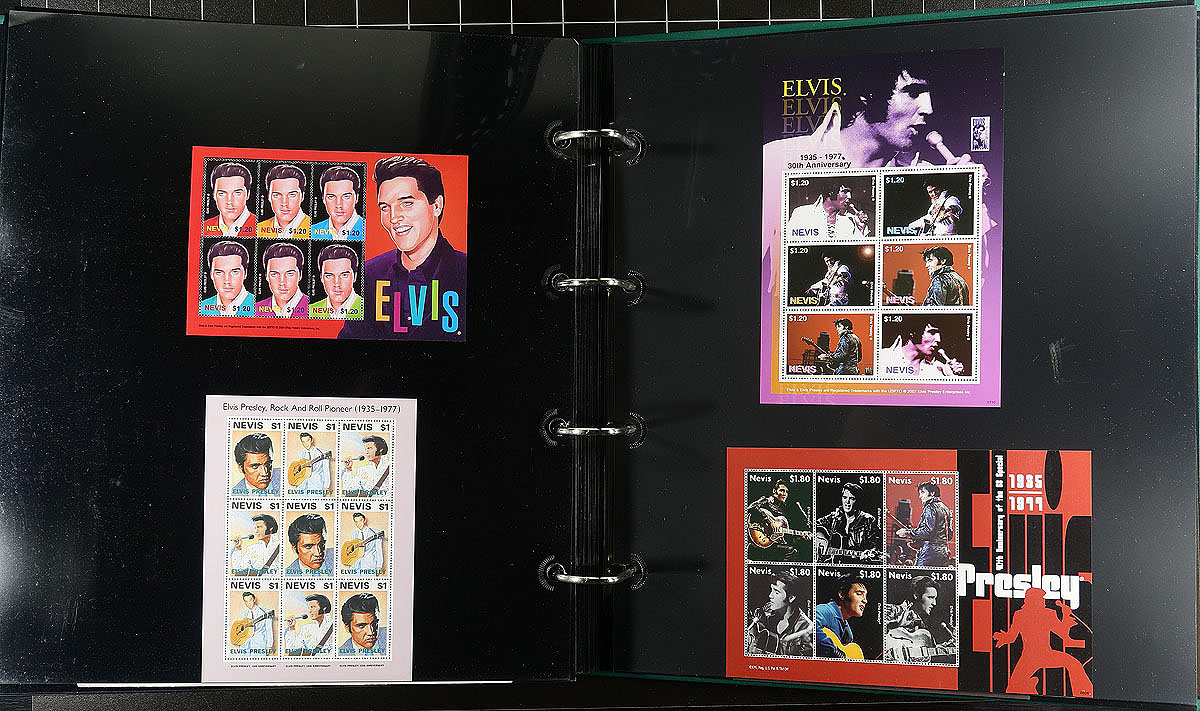 Part 1 - "United States" and "A" to "P" countries, with some "St. Vincent" in large 50 page full-sheet UniSafe four-ring binder with matching green slipcase (retail $140.00). A comprehensive, mint Never Hinged exhibit and collection of singles (a few are gold leaf high value singles), sets (including complete sets where Elvis was only one of the artists being commemorated), souvenir sheets, occasional maxi-card, first day cover, imperforate variety plus some progressive proofs. Cleanly laid out, comprehensive and with enormous initial cost ($200.00 for the proofs alone) with almost everything else easily have costing $5-$20 per set. Countries includes Albania, Antigua & Barbuda, Bhutan, Burkina Faso, Chad, Congo, Dominica, Gambia, Germany, Guinea-Bissau, Ghana, Grenada (& Grenadines), Guyana, Kurdistan, Liberia, Madagascar, Malagasy, Maldives, Marshall Islands, Micronesia, Mongolia, Nevis, Palau and Papua New Guinea. A total of 68 "world" stamps (+ 76 from the American issue, including a complete sheet), 159 souvenir sheets/sheetlets, 12 covers and 16 plate proofs pairs. Estimate =