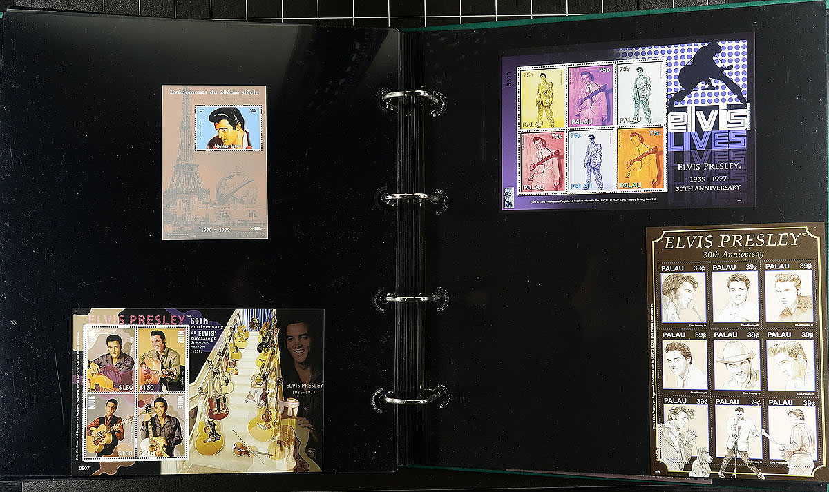 Part 1 - "United States" and "A" to "P" countries, with some "St. Vincent" in large 50 page full-sheet UniSafe four-ring binder with matching green slipcase (retail $140.00). A comprehensive, mint Never Hinged exhibit and collection of singles (a few are gold leaf high value singles), sets (including complete sets where Elvis was only one of the artists being commemorated), souvenir sheets, occasional maxi-card, first day cover, imperforate variety plus some progressive proofs. Cleanly laid out, comprehensive and with enormous initial cost ($200.00 for the proofs alone) with almost everything else easily have costing $5-$20 per set. Countries includes Albania, Antigua & Barbuda, Bhutan, Burkina Faso, Chad, Congo, Dominica, Gambia, Germany, Guinea-Bissau, Ghana, Grenada (& Grenadines), Guyana, Kurdistan, Liberia, Madagascar, Malagasy, Maldives, Marshall Islands, Micronesia, Mongolia, Nevis, Palau and Papua New Guinea. A total of 68 "world" stamps (+ 76 from the American issue, including a complete sheet), 159 souvenir sheets/sheetlets, 12 covers and 16 plate proofs pairs. Estimate =